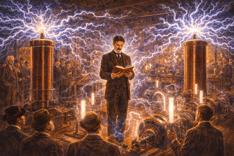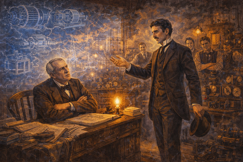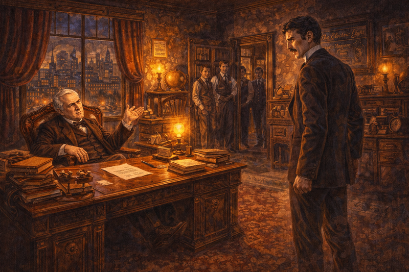 Tesla walked into Edison's office and presented his ideas for alternating current. Motors without brushes. Power transmitted over hundreds of miles. A complete system that could electrify the world.