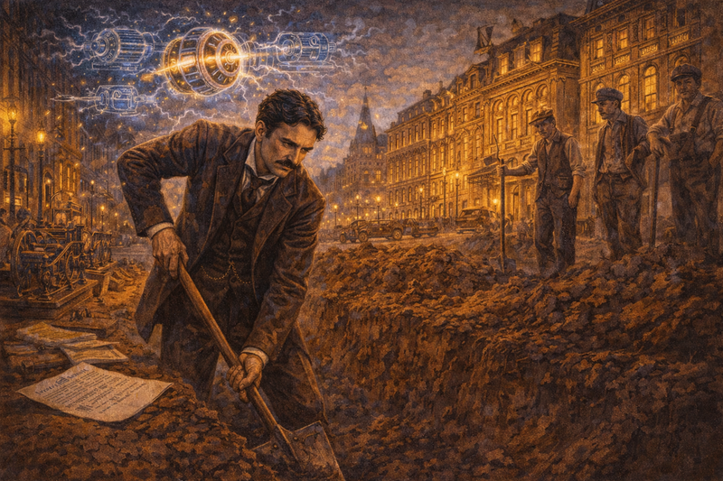1886 was Tesla's lowest point. Without Edison's backing, no one would fund his AC ideas. He was reduced to digging ditches for $2 a day—the same hands that had conceived the AC motor now blistered from manual labor.