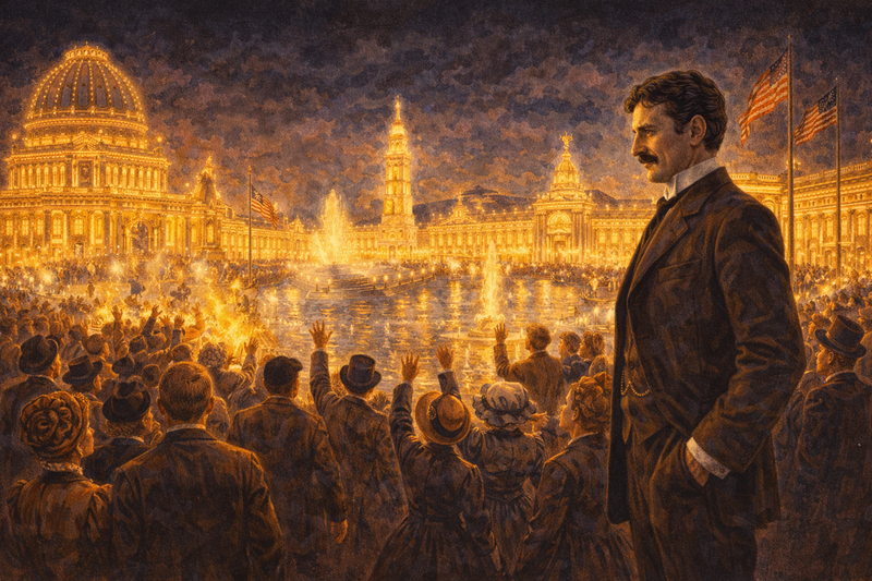 Tesla and his team worked frantically to build the system. On May 1, 1893, President Grover Cleveland pressed a button, and 100,000 incandescent bulbs blazed to life.