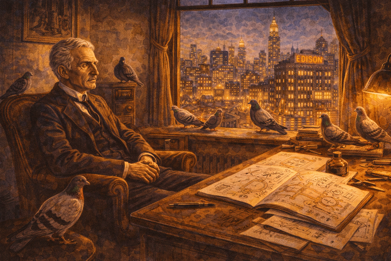Tesla's final decades were difficult. He gave up his Westinghouse royalties to save the company during a financial crisis—sacrificing millions. He moved from hotel to hotel, increasingly eccentric, feeding pigeons in the park, claiming to receive messages from other planets.