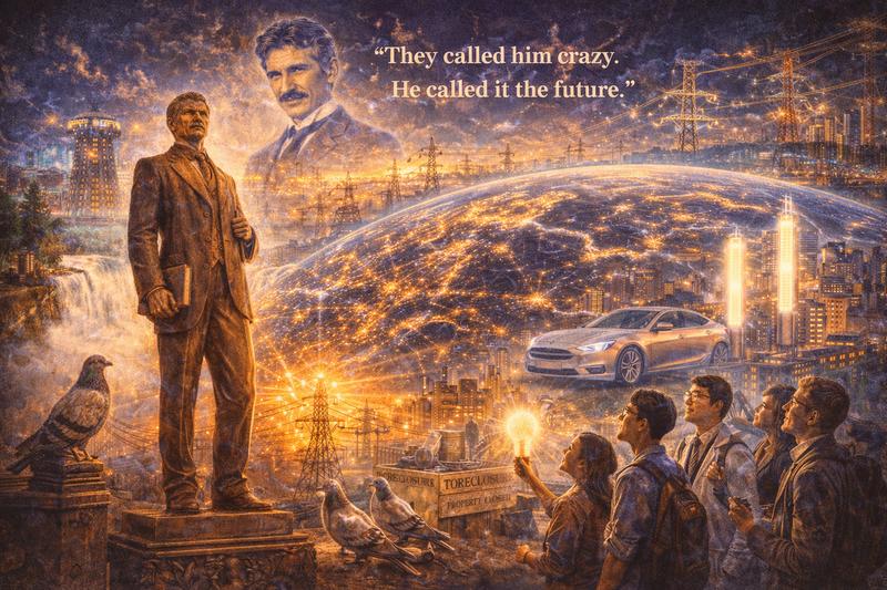 Image 14: Please generate a new wide-landscape illustration. A colorful, bright wide-landscape illustration blending historical and modern elements showing Tesla's eternal legacy. A statue of Tesla stands in the foreground—perhaps the real monument at Niagara Falls. Radiating from it, scenes of his impact: power lines crossing continents, electric motors in factories, a Tesla automobile bearing his name, smartphones communicating wirelessly (as he predicted), fluorescent lights, the glowing electrical grid seen from space. Above it all, the ghost of Tesla watches approvingly, no longer forgotten. Modern students and scientists look up at the statue with inspiration. Text floats: "They called him crazy. He called it the future." The scene celebrates vindication—the doubters are forgotten, but Tesla's light shines forever.Epilogue – What Made Tesla Different?