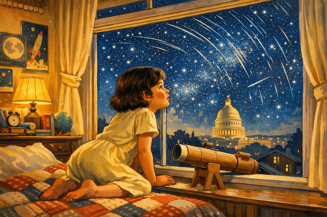 Image 1: Please generate a new wide-landscape illustration. A colorful, bright wide-landscape illustration in a 1930s American domestic style with cosmic elements showing young Vera Cooper, about 10 years old, at her bedroom window in Washington D.C. around 1938. She kneels on her bed, face pressed to the glass, watching a spectacular starry sky. A homemade cardboard telescope rests on the windowsill. Star trails arc across the night sky, showing the Earth's rotation. Through the window, the Capitol dome is visible in the distance. The warm yellow light of her bedroom contrasts with the deep blue of the night sky filled with thousands of stars. Her face shows wonder and determination. The scene conveys the birth of a lifelong passion for understanding the cosmos.Chapter 1 – "Women Don't Do That"