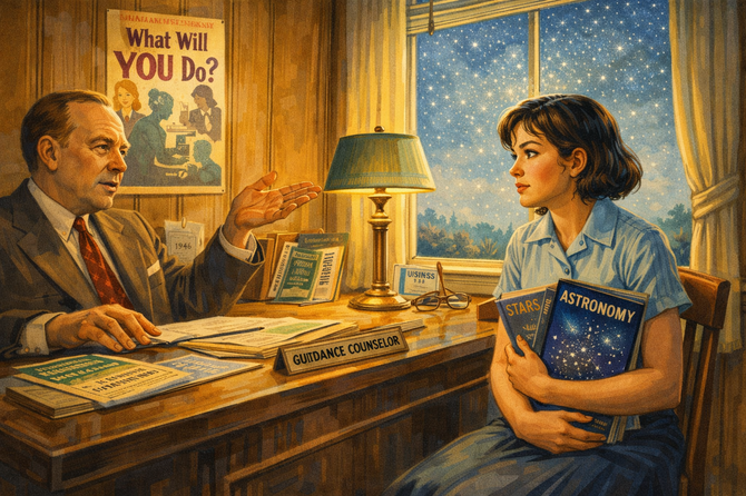 Image 2: Please generate a new wide-landscape illustration. A colorful, bright wide-landscape illustration in a 1940s American high school style showing young Vera Cooper, now about 17, sitting across from a guidance counselor in a wood-paneled office around 1946. The counselor, a middle-aged man in a suit, gestures dismissively while Vera holds astronomy textbooks and star charts. Her face shows quiet determination despite his condescension. On his desk are pamphlets for secretarial schools. Behind Vera, visible through the window, a daytime sky shows faint stars—visible only to her imagination. On the wall, a poster asks "What Will YOU Do?" The scene captures institutional dismissal meeting unshakeable determination.Chapter 2 – The Master's Thesis Nobody Believed