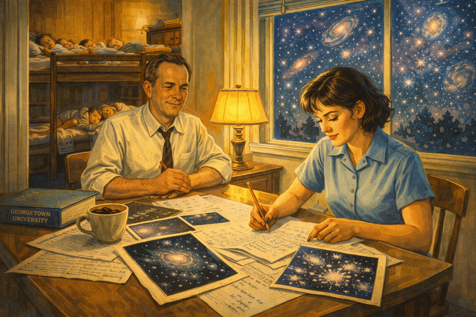 For years, Vera studied at night while her four children slept. Robert helped with childcare and encouraged her work. "Science needs you," he told her. "Don't give up."