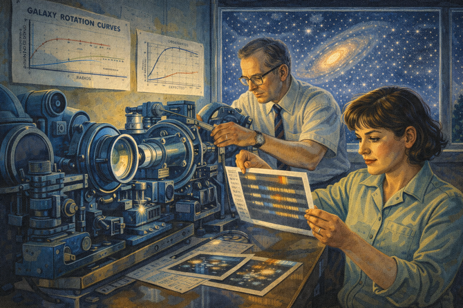 Image 6: Please generate a new wide-landscape illustration. A colorful, bright wide-landscape illustration in a 1970s scientific laboratory style showing Vera Rubin and Kent Ford working with their revolutionary spectrograph at the Carnegie Institution around 1970. The instrument is an intricate assembly of lenses, prisms, and photographic plates. Vera examines spectral data—bands of light revealing stellar velocities—while Kent adjusts the equipment. Charts on the wall show galaxy rotation curves. Through a window, the night sky displays the Andromeda Galaxy, their target. The instruments glow with a soft blue light. The scene conveys the technical innovation that would overturn cosmology.Chapter 6 – Stars That Move Too Fast