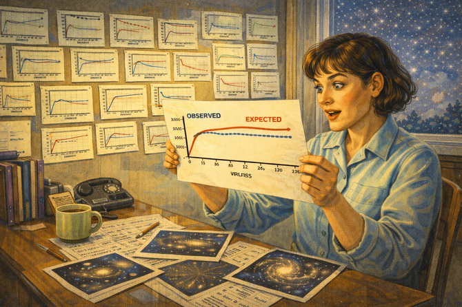 Vera checked her instruments. She checked her math. She observed galaxy after galaxy—Andromeda, dozens of spirals, galaxies of every type. The result was always the same: outer stars moved too fast.