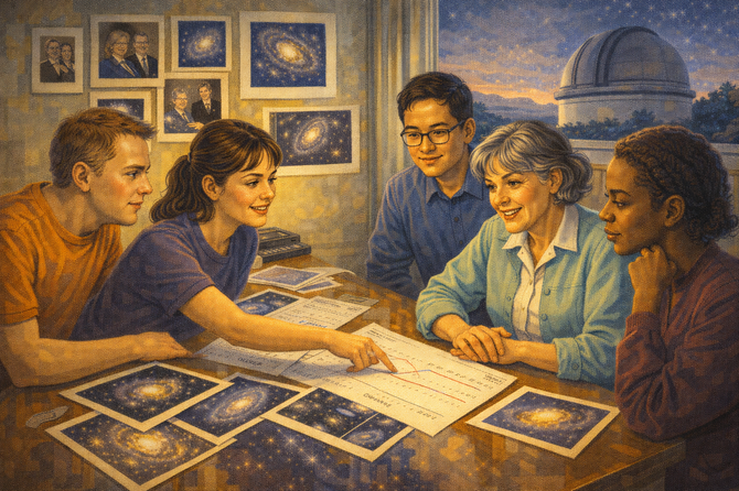 Image 10: Please generate a new wide-landscape illustration. A colorful, bright wide-landscape illustration in a late 20th century academic style showing Vera Rubin mentoring young astronomers at the Carnegie Institution around 1995. Now in her 60s with gray hair, she sits with a diverse group of graduate students—including several young women—around a table covered with galaxy photographs and rotation curve data. A female student points to data while Vera nods encouragingly. On the wall behind them are photos of Vera's achievements and images of spiral galaxies. Through the window, a telescope dome is visible against the evening sky. The scene conveys passing knowledge to the next generation and opening doors for others.Chapter 10 – The Prize She Never Won