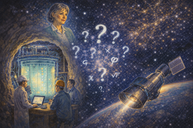 Image 12: Please generate a new wide-landscape illustration. A colorful, bright wide-landscape illustration in a modern physics style showing the ongoing hunt for dark matter. The scene is split: on the left, scientists work at a massive underground detector (like XENON or LUX)—a giant tank of liquid xenon surrounded by sensors in a cavern deep underground, shielded from cosmic rays. On the right, a space telescope scans the heavens for dark matter signals. In the center, ghostly question marks and particle symbols represent the unknown nature of dark matter. At the top, a portrait of Vera Rubin watches over the search she inspired. The cosmic web glows in the background. The scene conveys that her discovery launched a quest still underway.Chapter 12 – Written in the Stars