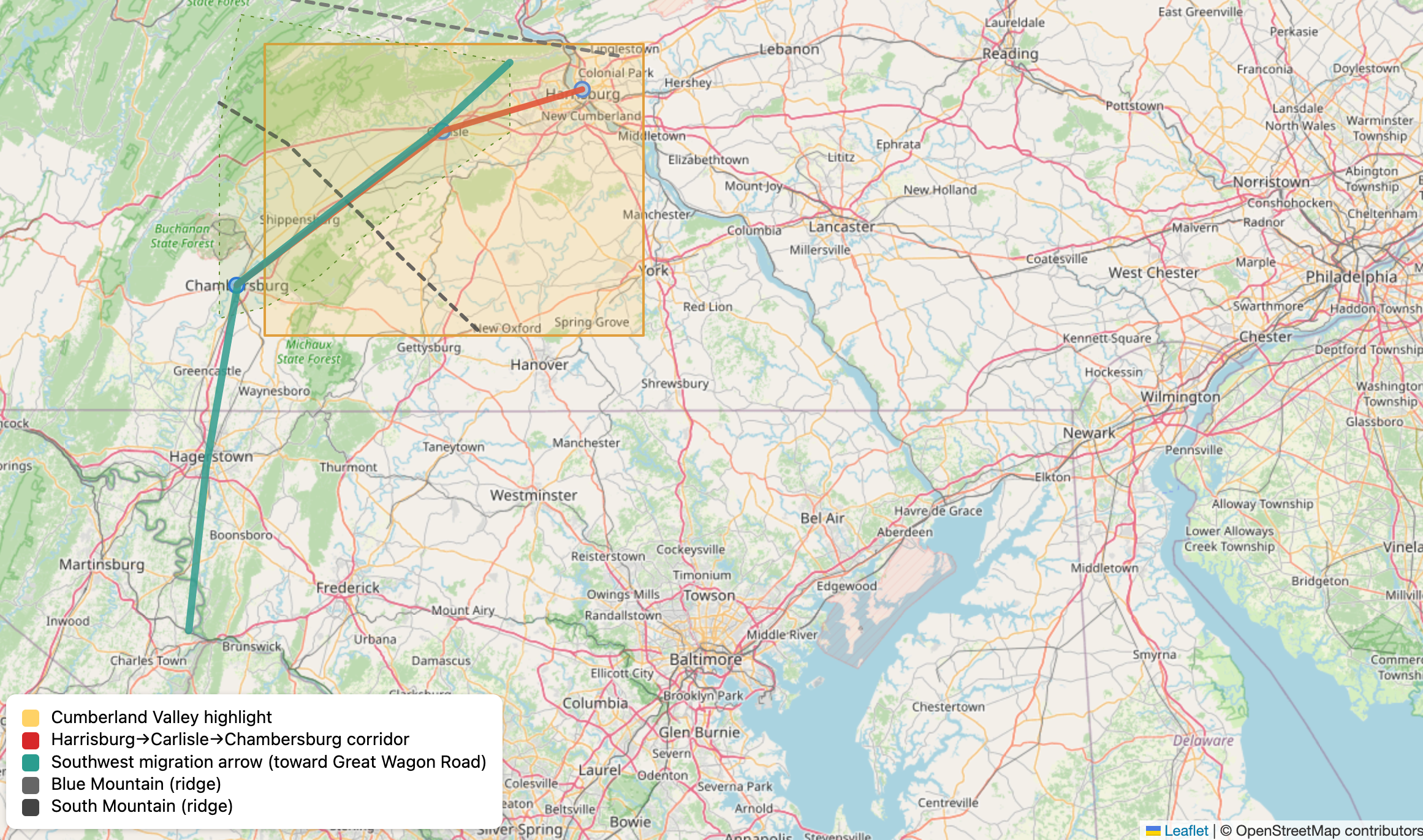 | Cumberland Valley | 1720s-1750s | Fertile valley, affordable land, first major concentration | Primary settlement area, largest concentration |