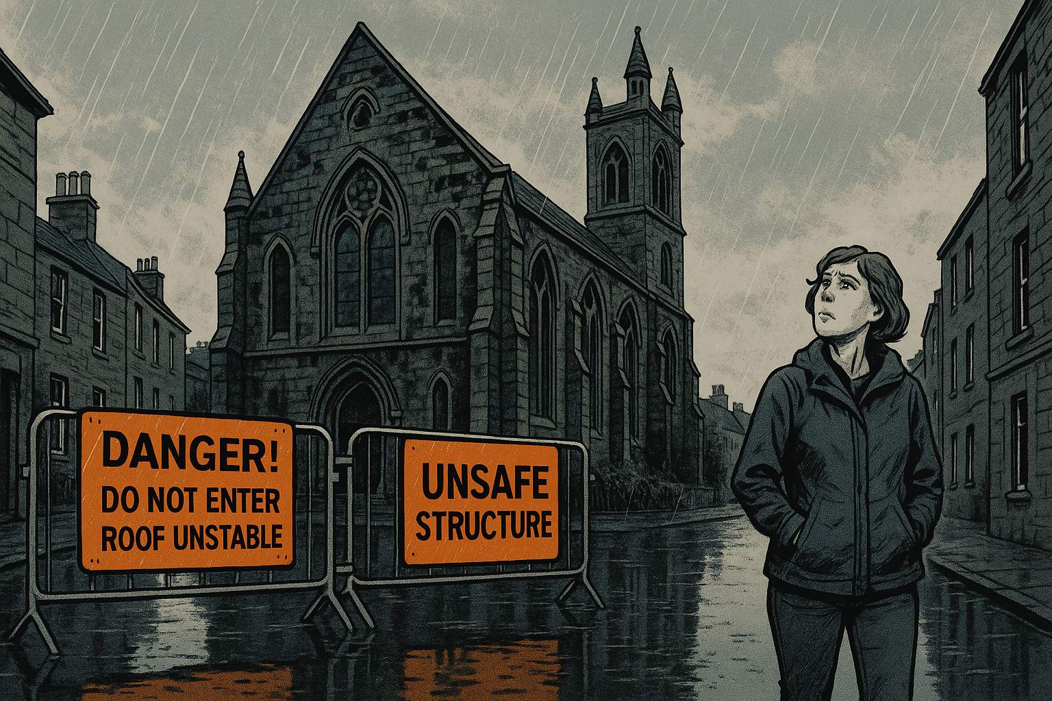Please generate a wide landscape drawing of this scene using a graphic-novel style drawing. Make sure that each image is consistent with the style of prior images. A contemporary Scottish street scene showing a beautiful but weathered stone church from the 1800s. The church has Gothic architecture with pointed arch windows and a tall bell tower. In the foreground, bright orange and black warning signs are prominently displayed on metal barriers: "DANGER! DO NOT ENTER - ROOF UNSTABLE" and "UNSAFE STRUCTURE". A middle-aged woman in modern clothing (jeans and a rain jacket) stands looking up at the church with a puzzled, concerned expression. Rain falls lightly, and puddles reflect the grey Scottish sky. The church's stonework shows dark water stains and patches of moss.Why are so many of Scotland's beautiful old churches abandoned with warning signs? What happened to these once-vital centers of community life?"
