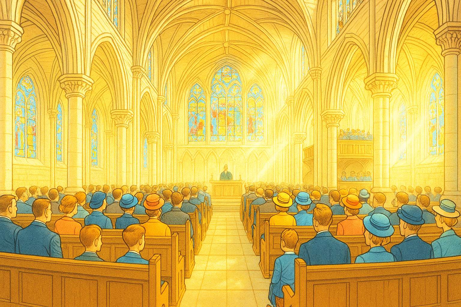 Please generate a wide landscape drawing of this scene using a graphic-novel style drawing. Make sure that each image is consistent with the style of prior images. A flashback scene to the 1950s showing the interior of a magnificent Scottish cathedral during Sunday service. The view looks down the central nave toward the altar, with soaring vaulted ceilings, elaborate stone columns, and brilliant stained glass windows casting colored light across the space. The pews are completely filled with well-dressed congregants - men in suits, women in hats and Sunday dresses, children in their best clothes. A choir in robes sings from the loft. The atmosphere is reverent and majestic, with dust motes visible in shafts of colored sunlight. The architectural details are ornate and beautifully maintained.For centuries, Scotland's churches were the heart of every community. Magnificent cathedrals and humble parish churches alike drew crowds every Sunday. Faith was woven into the fabric of Scottish life."
