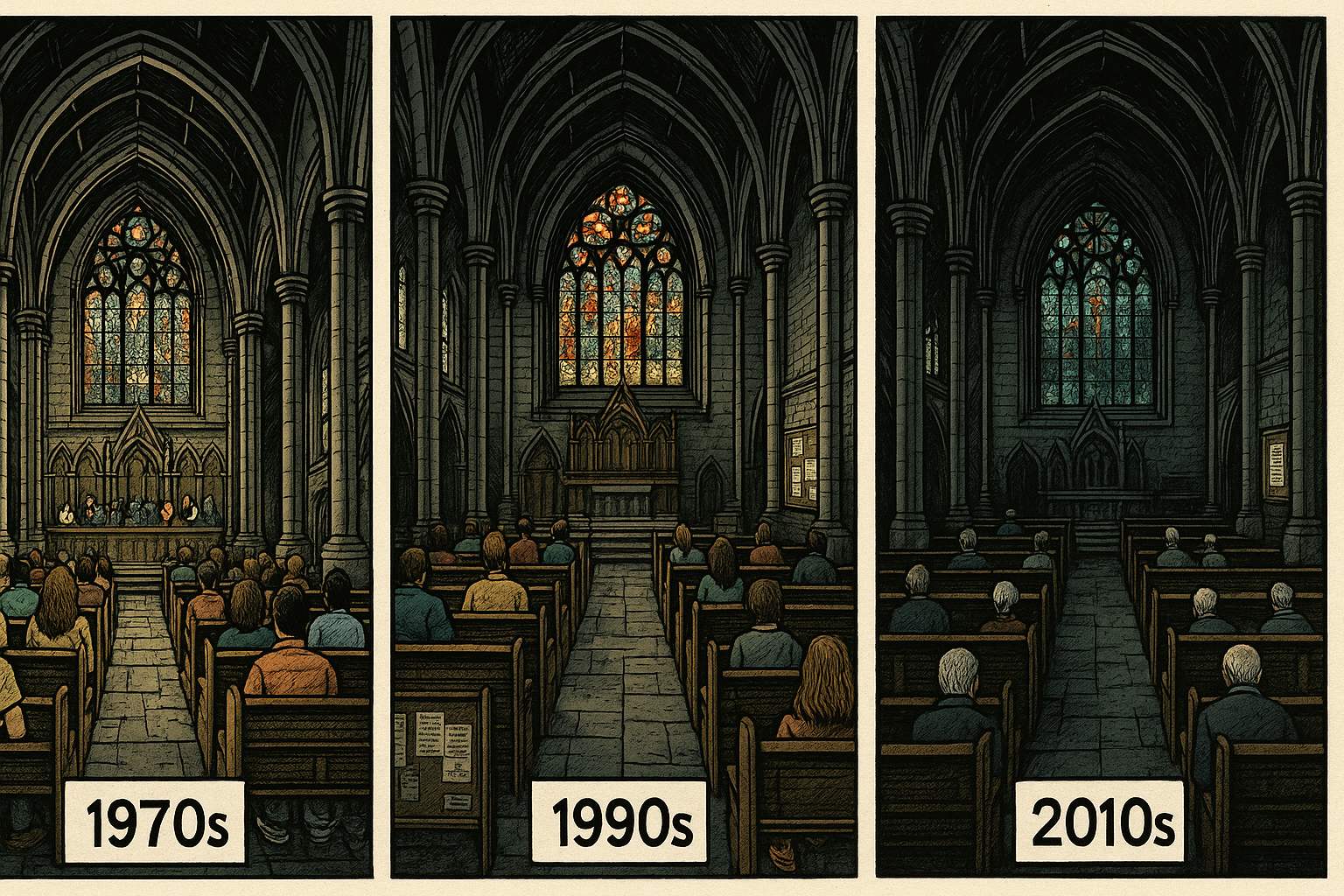 Please generate a wide landscape drawing of this scene using a graphic-novel style drawing. Make sure that each image is consistent with the style of prior images. A split-panel montage showing the same church interior across different decades. On the left, the 1970s with moderately full pews (about 60% capacity), people in more casual clothing. In the center, the 1990s with only 30% of pews filled, showing more empty space. On the right, 2010s with just scattered individuals and families (about 15% capacity) - mostly elderly people with grey hair. Each time period is subtly indicated by changing fashion styles and a calendar visible on a notice board. The lighting gradually becomes dimmer, and the congregation visibly ages and shrinks across the decades.But attendance began dropping in the 1960s and never stopped. Each generation attended less than the one before. The pews grew emptier year by year.