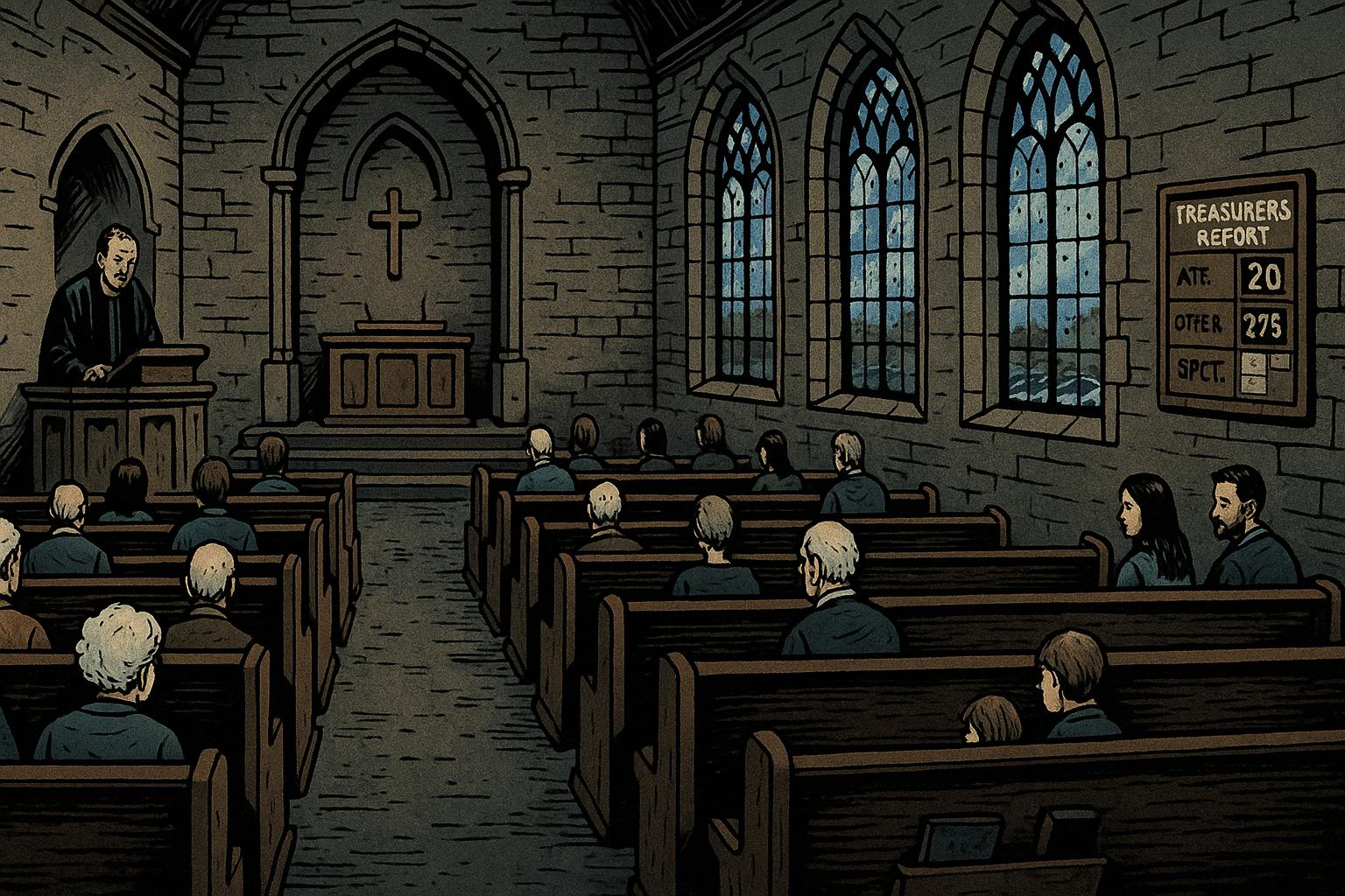 Please generate a wide landscape drawing of this scene using a graphic-novel style drawing. Make sure that each image is consistent with the style of prior images. A 2020 pre-COVID Sunday service scene showing a medium-sized stone church interior with Gothic windows. Only about 9% of the pews are occupied - roughly 20-25 people scattered throughout a space designed for 250. The congregants are predominantly elderly with white and grey hair. A tired-looking minister in robes stands at the pulpit. A young couple with a child sits near the back, looking somewhat out of place among the elderly majority. The treasurer's report board on the wall shows declining numbers. Through the windows, modern cars are visible in the parking lot. The space feels vast and echo-y.By 2020, just before COVID struck, only 9% of Scots attended church regularly. The faithful remnant was mostly elderly - people who had attended all their lives and wouldn't stop now.