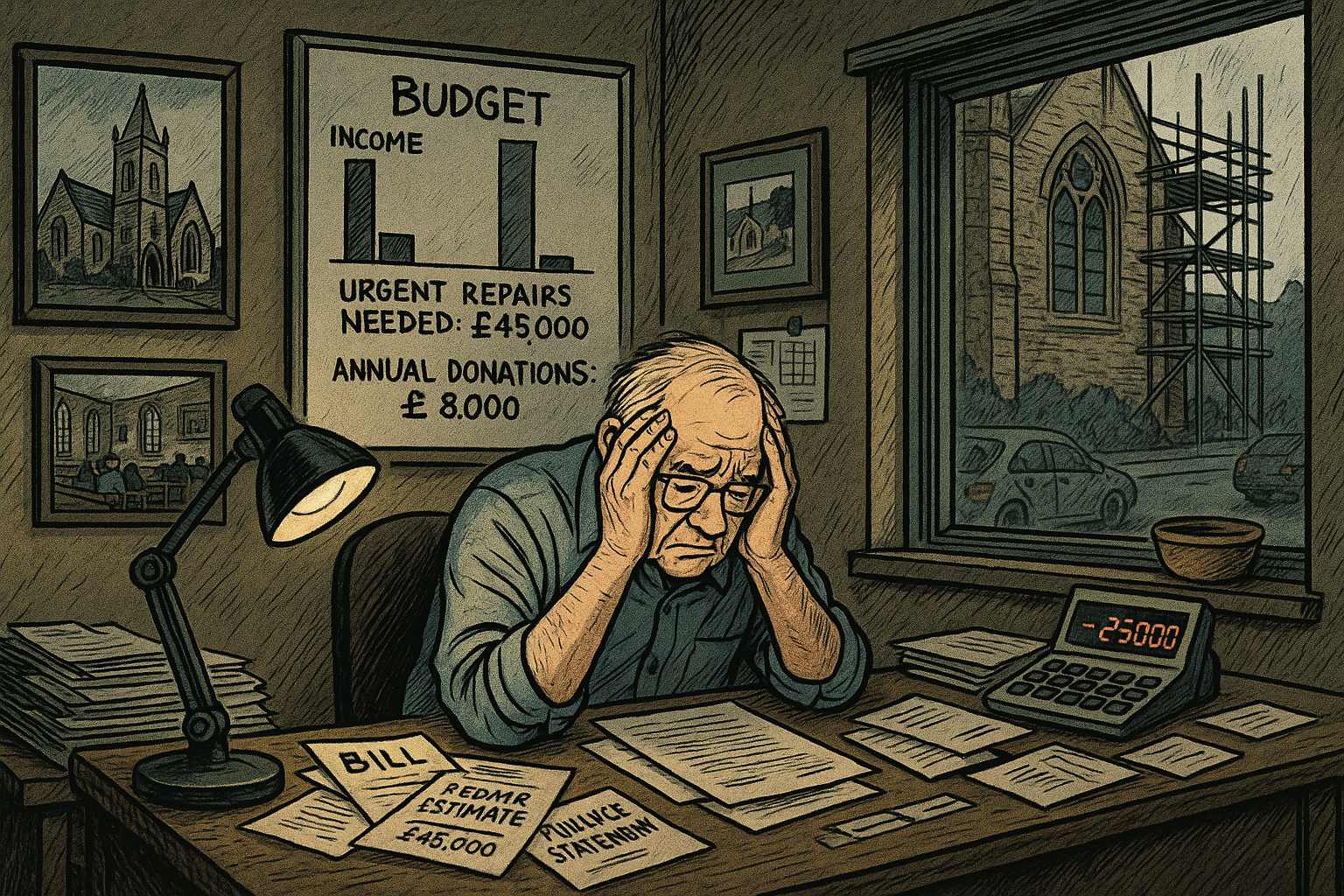 Please generate a wide landscape drawing of this scene using a graphic-novel style drawing. Make sure that each image is consistent with the style of prior images. A church office scene showing a church treasurer (an elderly man with glasses) sitting at a cluttered desk covered with bills, repair estimates, and financial statements. He holds his head in his hands in despair. A calculator shows red numbers. Behind him, a whiteboard displays a budget with income far below expenses, with "URGENT REPAIRS NEEDED: £45,000" and "ANNUAL DONATIONS: £8,000" clearly visible. Photographs on the wall show the same church in better times. Through the window, scaffolding can be seen on part of the church building. The lighting is dim and depressing, lit by a single desk lamp.Without enough members, church budgets collapsed. The math was brutal: medieval buildings require constant expensive maintenance, but donations now barely cover heating and the minister's salary. There was nothing left for repairs.