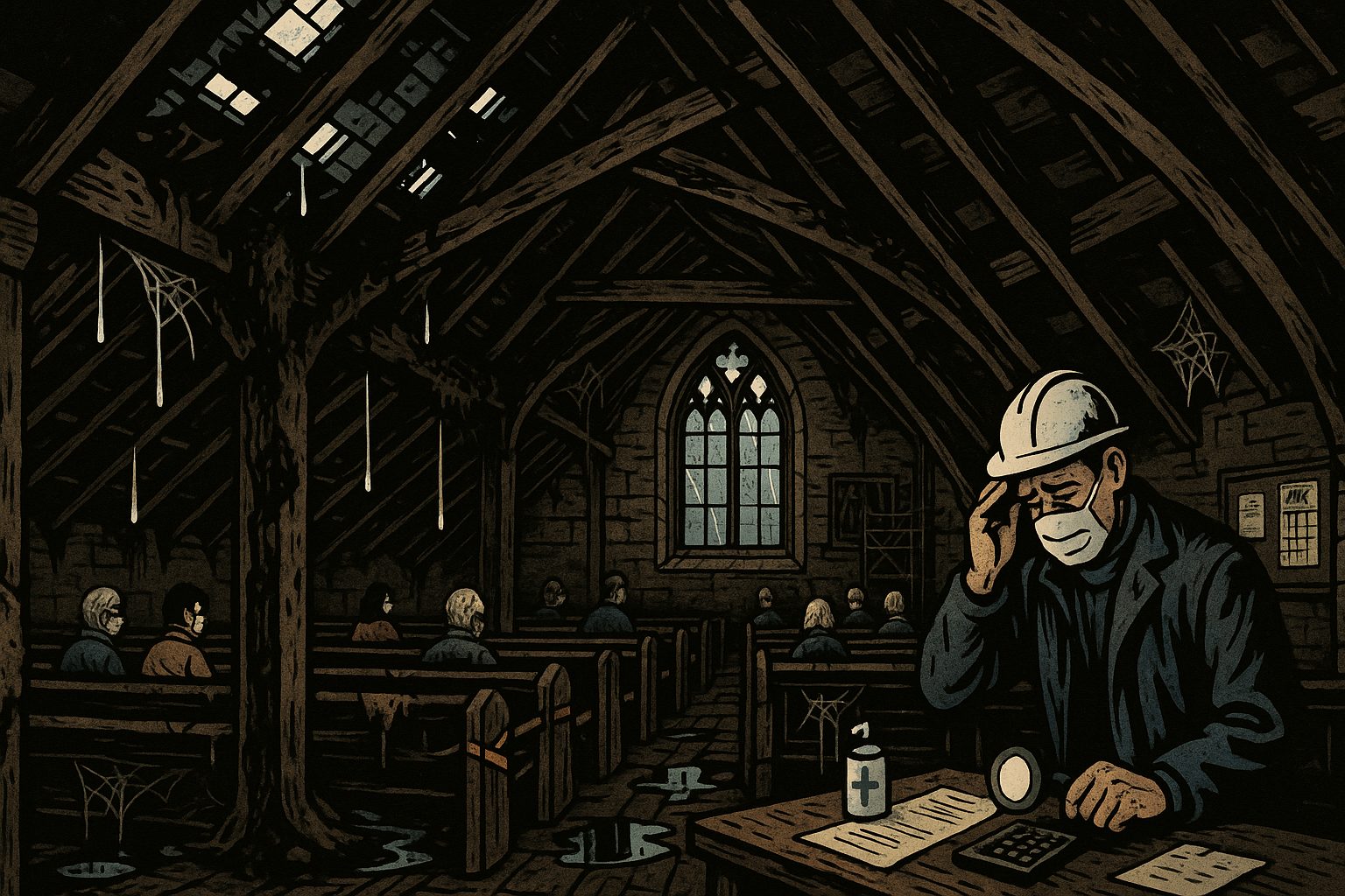 Please generate a wide landscape drawing of this scene using a graphic-novel style drawing. Make sure that each image is consistent with the style of prior images. A dramatic cutaway view showing the church's roof structure from inside the attic space. Water drips through multiple holes in the slate roof, with dark water stains spreading across the ancient timber beams. The wooden support beams show visible rot - dark, crumbling sections where the wood has turned soft and black. Fungal growth is visible on some timbers. Puddles have formed on the floor below. Spider webs hang between the beams. The scene is dark and ominous, lit by shafts of daylight coming through the roof holes. A roofer in a hard hat inspects the damage with a flashlight, shaking his head.Once the money ran out, small leaks went unrepaired. Scottish rain poured through gaps in the roof, soaking the medieval timber frames. The ancient wood, dry for centuries, began to rot with alarming speed.