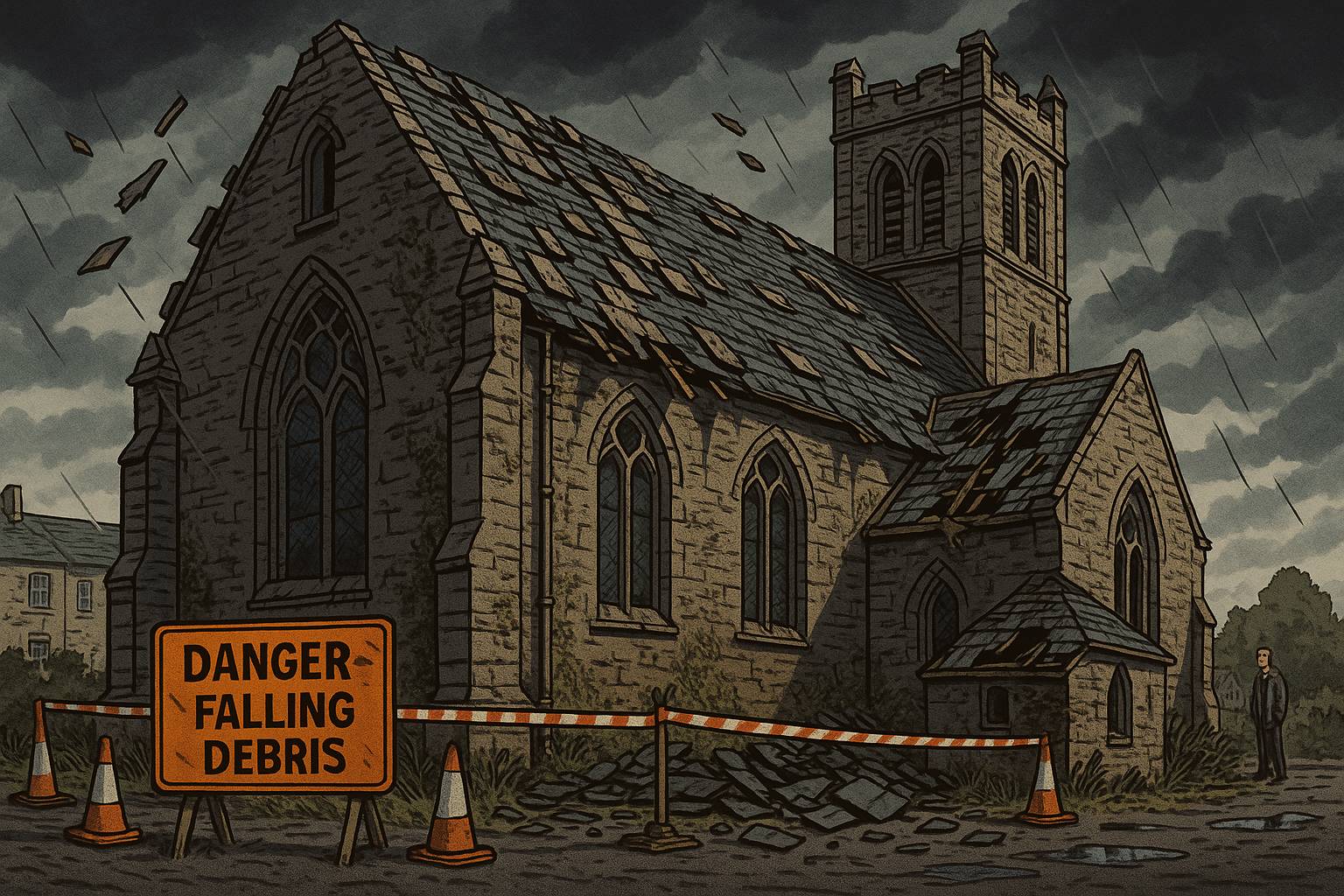 Please generate a wide landscape drawing of this scene using a graphic-novel style drawing. Make sure that each image is consistent with the style of prior images. An exterior view of the church from the side, showing the roof in deteriorating condition. Heavy slate tiles have fallen from the roof and lie shattered on the ground around the church building. More tiles are visibly loose, hanging at dangerous angles. Some have crashed through a side extension's roof. The church walls show impact damage where tiles have struck. Orange safety cones and warning tape surround the building's perimeter. A "DANGER - FALLING DEBRIS" sign is prominent. In the background, a concerned neighbor looks on from a safe distance. Dark storm clouds gather overhead. Weeds grow tall around the base of the building.As the roof timbers weakened, heavy slate tiles began to fall. Each tile weighed several kilograms - deadly projectiles crashing to the ground below. The buildings became dangerous to approach, forcing closure."
