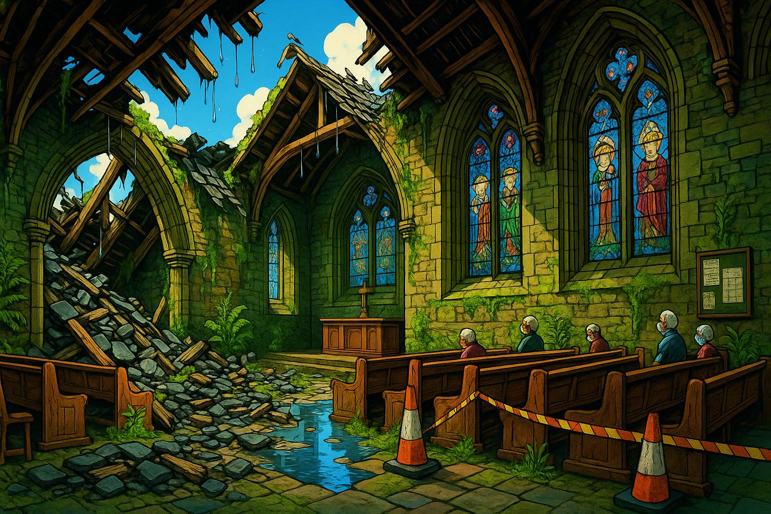 Please generate a wide landscape drawing of this scene using a graphic-novel style drawing. Make sure that each image is consistent with the style of prior images. Make this image be much brighter and more full of rich color than the prior images. A devastating interior scene showing partial roof collapse inside the church sanctuary. A large section of the ceiling has caved in, with broken timbers, slate tiles, and stone rubble covering the pews below. Bright sunlight streams through the gaping hole in the roof. Bright green moss has begun growing on the wet wood and stone. Ferns sprout from cracks in the walls. Pigeons roost on the exposed beams. Water pools on the floor, reflecting the bright blue sky above. The stained glass windows remain intact but are covered in grime. The altar area is relatively undamaged but abandoned. The scene is both tragic and eerily beautiful as verdant green nature reclaims the space.Without repairs, the inevitable happened. Ceiling sections collapsed inward. Scottish rain and wind now pour freely inside. Moss quickly colonized the damp stonework, covering surfaces that had been dry for 800 years.