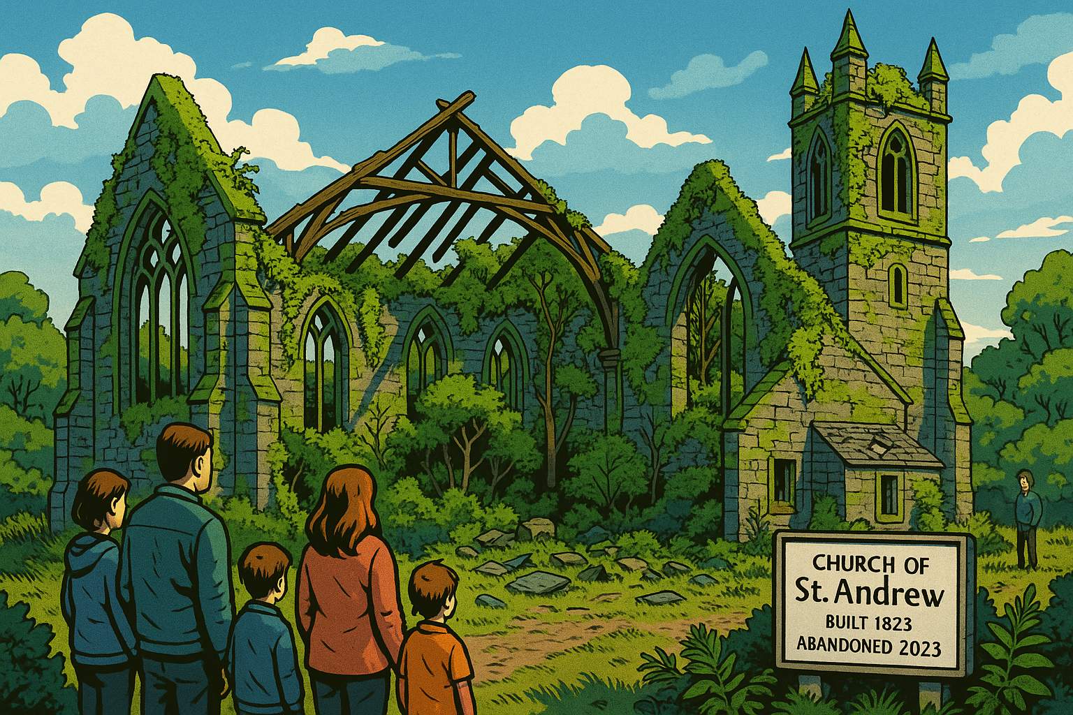 Please generate a wide landscape drawing of this scene using a graphic-novel style drawing. Make sure that each image is consistent with the style of prior images. A wide landscape view showing the same church from Panel 1, but now in an advanced state of ruin just a few years later. The roof is mostly gone, with only skeletal timber beams remaining. The bell tower stands but is covered in moss and vegetation. Trees and bushes grow inside the roofless nave. The Gothic windows are still beautiful but frame open sky instead of stained glass. The stonework is thick with moss and ivy. The building now resembles the ancient medieval ruins that tourists visit. In the foreground, a modern Scottish family - parents and two children - stand looking at the ruin with sadness. A historic information plaque has been erected: "Church of St. Andrew, Built 1823, Abandoned 2023." The scene has a melancholic beauty.In just five to ten years, churches that stood proud for centuries now look like ancient ruins. Scotland's religious collapse happened not over centuries, but in a single generation. These aren't medieval ruins - they're the fresh casualties of our secular age.