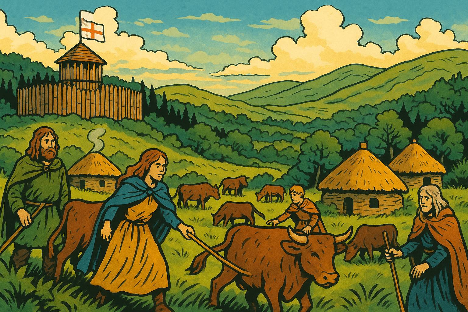 Please generate a wide landscape drawing of this scene using a graphic-novel style drawing. Use a bright palette of colors. Make sure that each image is consistent with the style of prior images. Show the lush, wild Irish countryside of Ulster around 1600. In the foreground, Gaelic Irish families tend cattle in communal fields, their traditional clothing and thatched roundhouses visible. In the middle ground, a wooden palisade fort sits on a hill, flying the English flag. In the background, dense forests and rolling green hills stretch to the horizon. The scene should feel both beautiful and untamed, with a sense of tension between the native Irish way of life and the distant English presence.Before the plantations, Ulster was a land of cattle raids, bardic poetry, and Gaelic lords who weren't particularly interested in English ideas about "proper" land ownership. The English controlled some coastal forts and towns, but mostly they just watched nervously from their wooden walls while the Irish did their own thing. Think of it as a very long, very green standoff—except one side had Shakespeare and the other had significantly better cattle.