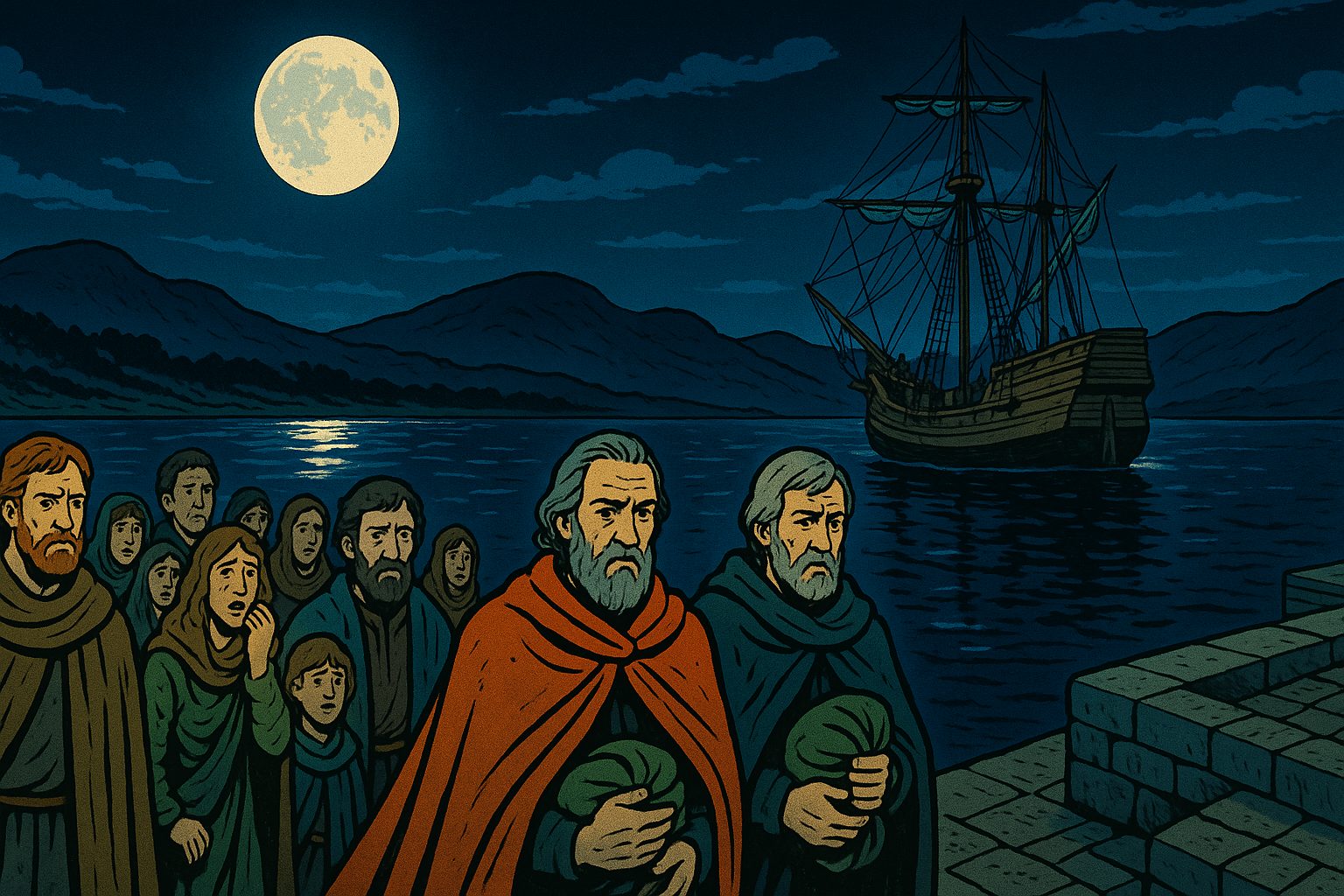 Please generate a wide landscape drawing of this scene using a graphic-novel style drawing. The width:height ratio is 16:9. Use a bright palette of colors. Make sure that each image is consistent with the style of prior images. Depict a moonlit Irish harbor with a ship preparing to depart. In the foreground, Hugh O'Neill and other Irish earls in fine cloaks walk toward the vessel, carrying small bundles—all that remains of their possessions. Behind them, their followers and family members watch with expressions of sorrow and disbelief. In the background, the dark outline of Ulster's hills looms. The mood should be melancholy but dramatic, with the moon creating a silver path on the water leading away from Ireland.When Ulster's Gaelic lords—including the mighty Hugh O'Neill—realized they couldn't win against English expansion, they pulled off history's most consequential Irish goodbye. In 1607, they sailed for continental Europe, abandoning four million acres and their people. King James I looked at all that empty land and had what he considered a brilliant idea: "Let's fill it with Scots!" History would prove this decision... complicated.