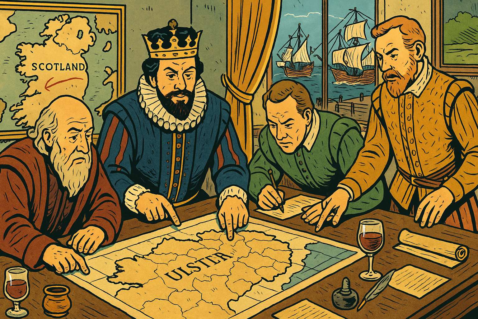 Please generate a wide landscape drawing of this scene using a graphic-novel style drawing. The width:height ratio is 16:9. Use a bright palette of colors. Make sure that each image is consistent with the style of prior images. Show an elaborate planning room in London with maps of Ulster spread across a large table. King James I and his advisors point at different regions, dividing the land into neat parcels. On the walls hang maps showing Scotland and Ireland, with lines drawn between them. Through the window, we can see both Scottish and English ships being prepared. The scene should emphasize the clinical, bureaucratic nature of the plantation scheme—men in fancy clothing casually redesigning an entire country over wine and documents.The Ulster Plantation wasn't some spontaneous land grab—it was meticulously planned, right down to the required dimensions of defensible buildings. The scheme promised Scottish and English "undertakers" cheap land, but with conditions: build stone houses, create fortified settlements, and absolutely do not rent to the native Irish. It was social engineering on a massive scale, designed to transform Ulster from Gaelic and Catholic to British and Protestant. What could possibly go wrong?