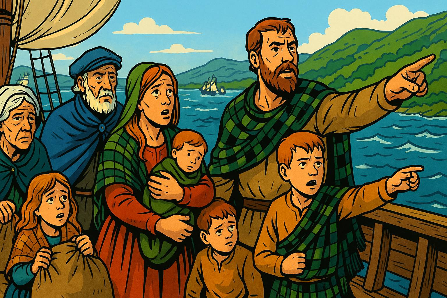 Panel 4 Please generate a wide landscape drawing of this scene using a graphic-novel style drawing. The width:height ratio is 16:9. Use a bright palette of colors. Make sure that each image is consistent with the style of prior images. Illustrate a small sailing vessel crossing the narrow North Channel between Scotland and Ireland. On deck, a McCreary family—parents, children, and elderly grandparents—clutch their belongings while pointing toward the green coast of Ulster emerging from the mist. The sea is choppy but manageable. Behind them, the Scottish coast fades away; ahead, their new home awaits. Include a few other ships in the background, showing this was part of a larger migration. The family's expressions should mix hope, apprehension, and seasickness in equal measure.For lowland Scots like the McCrearys, Ulster was a tempting opportunity—only 13 miles across the water at the narrowest point, cheaper than that morning's ferry to Belfast. They arrived by the thousands, carrying their Presbyterian faith, their agricultural skills, and their deep suspicion of both Catholic Irish and Anglican English. The McCrearys settled their granted lands, built their stone farmhouses, and promptly discovered that "no Irish tenants" rule was completely unenforceable. Turns out you need workers, and the Irish were already there.