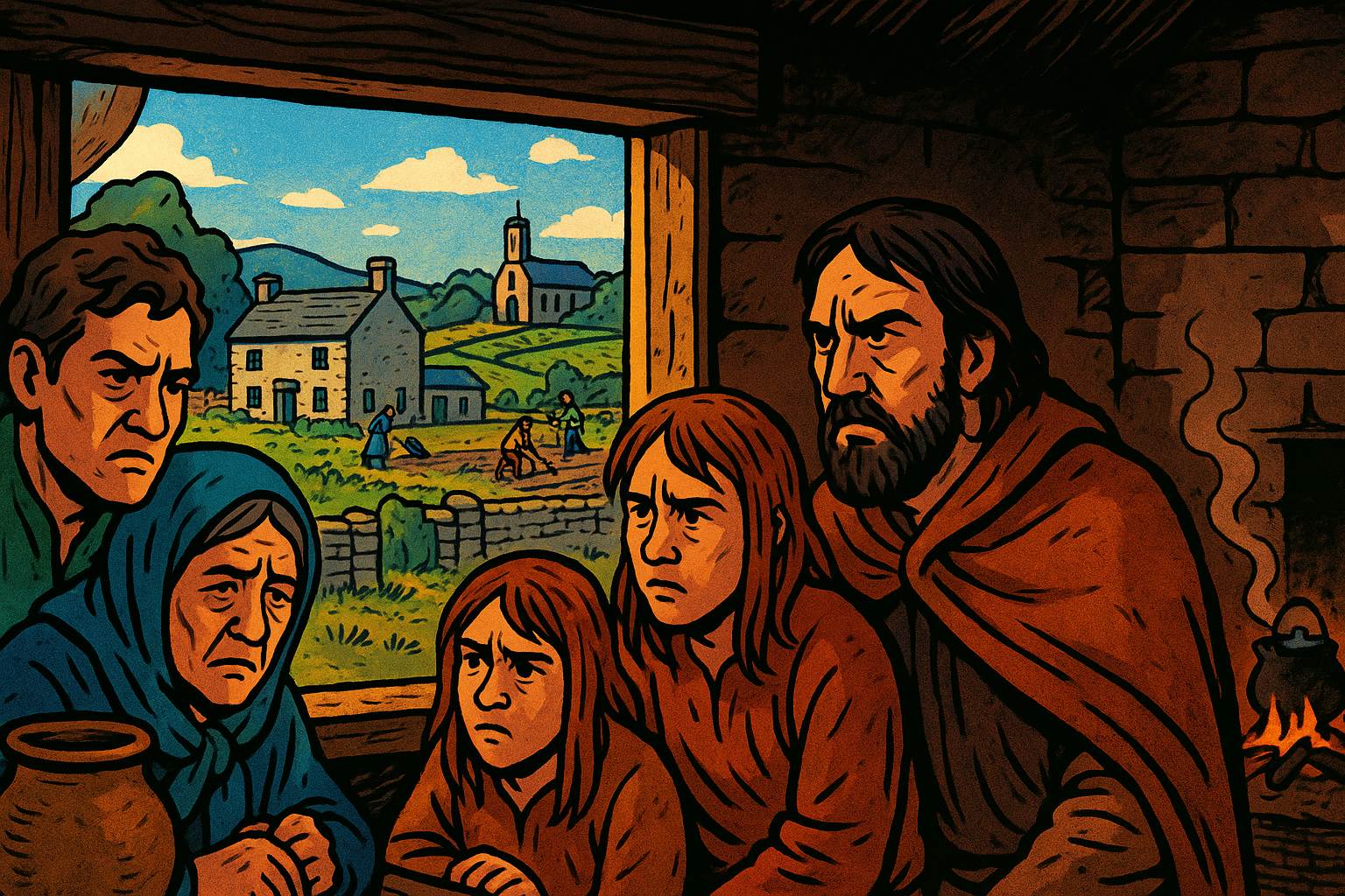 Panel 6 Please generate a wide landscape drawing of this scene using a graphic-novel style drawing. The width:height ratio is 16:9. Use a bright palette of colors. Make sure that each image is consistent with the style of prior images. Depict an Irish Catholic family huddled in a small cottage, looking through a window at their former lands now occupied by Scottish settlers. Outside, we can see the stone houses and prosperous farms of the plantation. The Irish family's possessions are few; their expressions combine resentment, grief, and anger. In the background, show the contrast between their modest dwelling and the settler prosperity. Include subtle details showing they're now tenants or laborers on land their ancestors owned.For the native Irish, the plantation was catastrophic. Their lords had fled, their lands were confiscated, and they found themselves reduced to tenants or laborers on their ancestral territories. The English and Scots weren't just taking land—they were importing a completely different social order, language, and religion. Imagine strangers showing up with legal documents saying they now own your farm, and you can work for them if you behave. The Irish Catholics didn't forget. They bided their time.