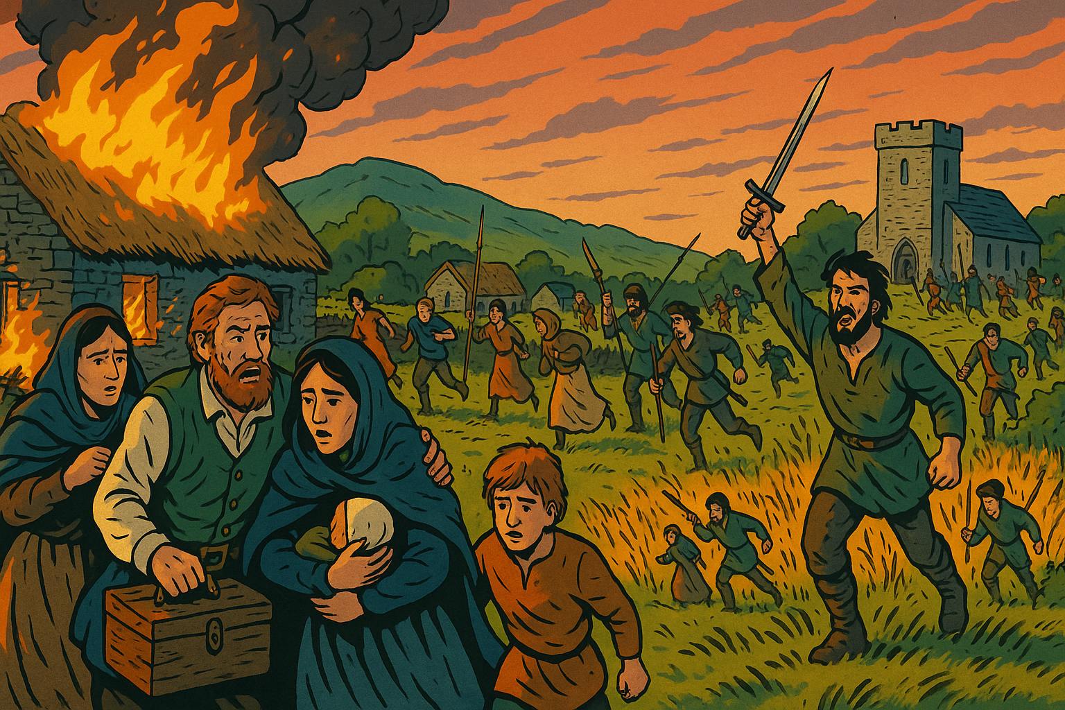 Panel 7 Please generate a wide landscape drawing of this scene using a graphic-novel style drawing. The width:height ratio is 16:9. Use a bright palette of colors. Make sure that each image is consistent with the style of prior images. Show the dramatic moment of rebellion: Irish Catholic forces attacking a plantation settlement at dawn. In the foreground, families like the McCrearys flee their homes with whatever they can carry, their stone house burning behind them. Armed Irish rebels advance from the fields. Other Scottish settlers fight back or run toward a fortified church in the distance. The scene should be chaotic but not gratuitously violent—emphasize the panic, the smoke, the sudden reversal of fortune. Make it clear this is an organized uprising, not random violence.In October 1641, after thirty years of simmering resentment, Ulster's Irish Catholics rose in coordinated rebellion. The plantation experiment exploded into violence as rebels attacked settlers, seeking to reclaim their lands and drive out the planters. Thousands of Scots and English were killed, more were stripped of possessions and driven from their farms. The McCrearys, like other Presbyterian families, fled to fortified towns or fought back desperately. What had been an uneasy coexistence became a sectarian bloodbath that would poison Ulster's soil for centuries.