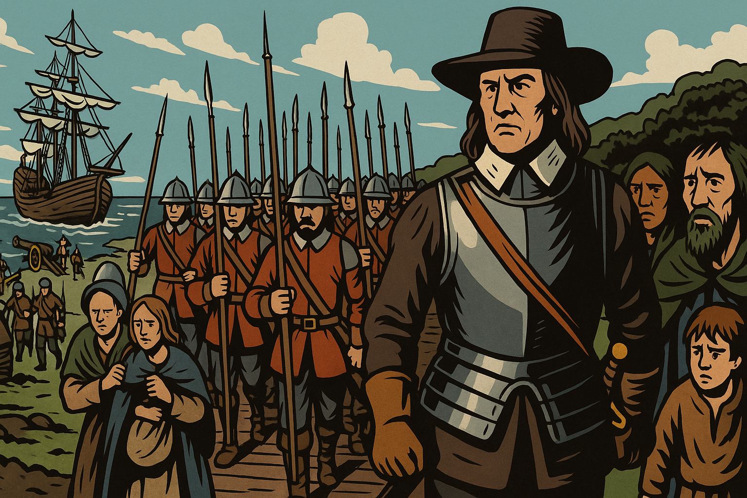 Panel 8 Please generate a wide landscape drawing of this scene using a graphic-novel style drawing. The width:height ratio is 16:9. Use a bright palette of colors. Make sure that each image is consistent with the style of prior images. Illustrate Oliver Cromwell landing in Ireland with his New Model Army. Show him in his iconic armor and broad hat, standing on a ship's gangplank with disciplined soldiers marching off behind him in perfect formation. They carry pikes, muskets, and cannons. The soldiers look grim and purposeful, in stark contrast to the fearful Irish onlookers in the background. In the harbor, more ships unload supplies and troops. Cromwell's face should be stern, determined, and utterly uncompromising.Eight years of chaos later, Oliver Cromwell arrived in Ireland with England's professional New Model Army and a divine mission to punish Irish "barbarism." The English Parliament wanted revenge for 1641, wanted Ireland firmly controlled, and wanted to pay their army with confiscated Irish land. Cromwell was happy to oblige—he believed he was doing God's work. The Irish were about to learn that sometimes the cure is worse than the disease.