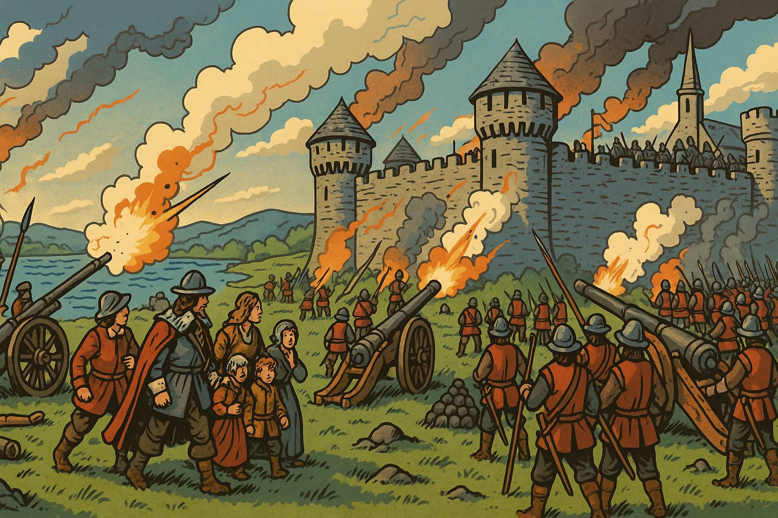 Panel 9 Please generate a wide landscape drawing of this scene using a graphic-novel style drawing. The width:height ratio is 16:9. Use a bright palette of colors. Make sure that each image is consistent with the style of prior images. Show Cromwell's forces besieging the walled town of Drogheda. Depict the stone walls of the city, with smoke and cannon fire. Cromwell's artillery batters the defenses while his soldiers prepare to assault. Inside the walls, defenders man the ramparts. The scene should convey the overwhelming military power Cromwell commanded without showing graphic violence—emphasize the siege machinery, the professional army, the inevitable outcome. The composition should make clear that this is industrial-scale warfare, not a cattle raid.When Drogheda's garrison refused to surrender, Cromwell made an example of them that would echo through Irish history. His forces stormed the walls and killed nearly the entire garrison—some 3,500 soldiers and many civilians. "I am persuaded that this is a righteous judgment of God," Cromwell wrote, apparently untroubled by conscience. He repeated the performance at Wexford weeks later. The message was clear: resistance would not be tolerated, and mercy was not on the menu.