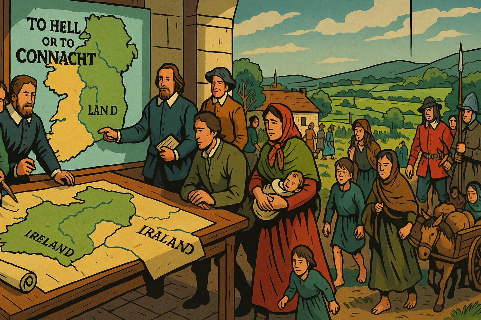 Panel 10 Please generate a wide landscape drawing of this scene using a graphic-novel style drawing. The width:height ratio is 16:9. Use a bright palette of colors. Make sure that each image is consistent with the style of prior images. Depict the aftermath of Cromwell's conquest: a map of Ireland being redrawn by English administrators. Show them redistributing land, with Catholic landowners being pushed to marginal lands in Connacht ("To Hell or to Connacht" was the grim choice). In the foreground, Catholic families travel westward with their few possessions. In the background, Protestant settlers—including returning Presbyterian families like the McCrearys—move onto the newly redistributed lands. Include soldiers overseeing the transfers. The scene should convey the massive demographic engineering taking place.By 1653, Cromwell's conquest was complete. Catholic landholding plummeted from 60% to 20% of Ireland. Thousands of Irish were killed, transported to the West Indies, or driven to marginal western lands. Protestant control—including the restored Ulster Plantation—was absolute. The McCrearys and other Presbyterian families returned to their lands, now more secure than ever. They had survived rebellion and reconquest. Surely now they could live in peace? (Narrator: They could not.)