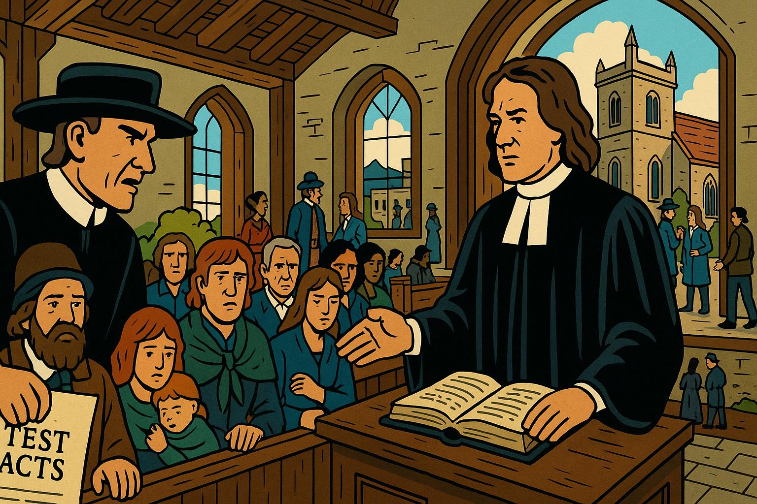 Panel 11 Please generate a wide landscape drawing of this scene using a graphic-novel style drawing. The width:height ratio is 16:9. Use a bright palette of colors. Make sure that each image is consistent with the style of prior images. Show a Presbyterian church service being interrupted by Anglican officials. The McCreary family sits in the pews while a church official presents documents—the Test Acts that discriminate against Presbyterian dissenters. Outside the window, show an Anglican church with finer architecture. Include scenes of Presbyterians being denied political office, having their marriages questioned, and facing increased rents as plantation-era leases expire. The Presbyterians' faces should show frustration and growing disillusionment—they helped secure Protestant Ireland, but they're still second-class citizens.Victory's sweetness was short-lived. The restored monarchy and Anglican establishment viewed Presbyterians as barely better than Catholics. The Test Acts barred them from political office. Their marriages weren't fully recognized. Their schools faced restrictions. And economically, as plantation leases expired, landlords jacked up rents mercilessly. The McCrearys had crossed the sea to escape religious discrimination, fought to defend their farms, and now found themselves squeezed between Catholic resentment below and Anglican condescension above. Ireland was beginning to feel like a bad investment.