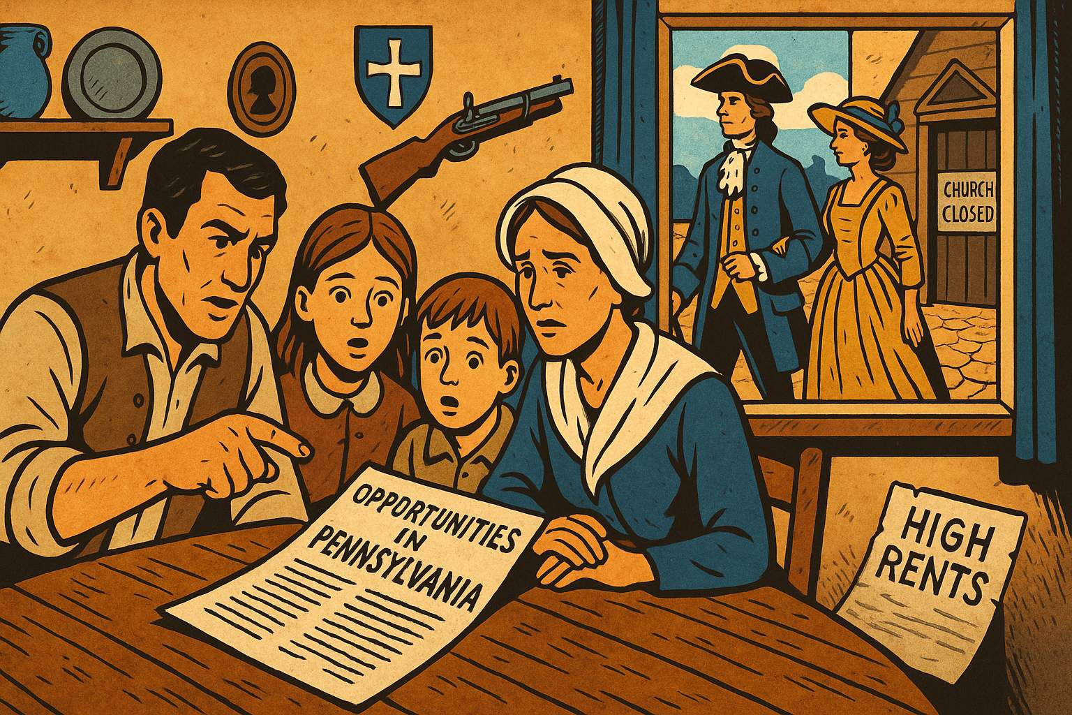 Panel 12 Please generate a wide landscape drawing of this scene using a graphic-novel style drawing. The width:height ratio is 16:9. Use a bright palette of colors. Make sure that each image is consistent with the style of prior images. Show a Ulster Presbyterian family around their dinner table, with an open letter or pamphlet describing opportunities in Pennsylvania. On the walls, show the family's modest possessions and Presbyterian symbols. Through the window, wealthy Anglican neighbors pass by in fine clothing. The father points at the American pamphlet while the mother looks concerned but hopeful. Children listen with wide eyes. Include visual elements suggesting drought (cracked earth visible through window), high rents (a notice on the table), and religious restrictions (a closed church in the background).By the 1710s, Ulster Presbyterians were reading letters from America that made Pennsylvania sound like the Promised Land: cheap land, religious freedom, no Anglican bishops, and no memory of 1641's bloodshed. When drought devastated Ulster's harvest in 1717-18, the decision became easy. The McCrearys, like thousands of Scotch-Irish families, decided that after a century of Scotland-to-Ireland, maybe Ireland-to-America would finally work out. Third time's the charm, right?
