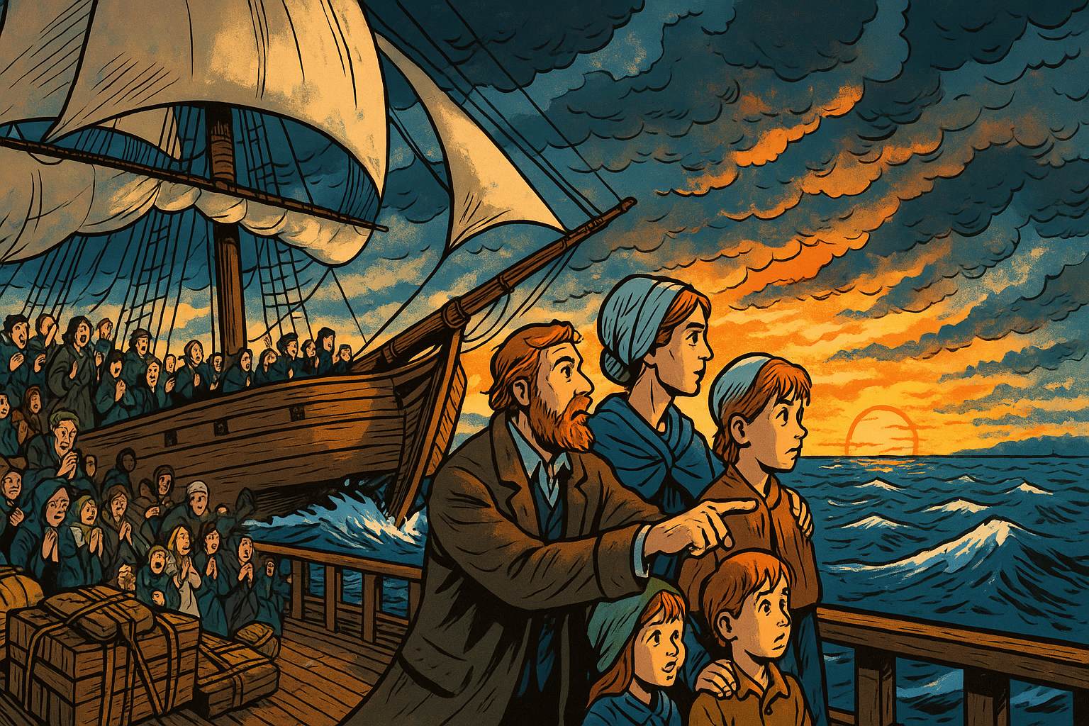 Panel 13 Please generate a wide landscape drawing of this scene using a graphic-novel style drawing. The width:height ratio is 16:9. Use a bright palette of colors. Make sure that each image is consistent with the style of prior images. Illustrate a sailing ship crossing the Atlantic, cutting through rough seas. On deck, the McCreary family stands at the rail, looking westward toward the setting sun. Behind them, the Irish coast has long vanished. Their possessions are lashed to the deck. Other Presbyterian families crowd the ship—men, women, children, all leaving Ulster behind. Some pray, some sing Psalms, some look seasick. The composition should emphasize journey and transition—leaving one world for another. Make the sky dramatic with storm clouds parting to show clearer skies ahead (subtle metaphor alert!).The Atlantic crossing took eight brutal weeks in cramped, disease-ridden ships. But the McCrearys and their fellow Ulster Scots were tough—they'd survived Scotland's religious persecution, Ireland's rebellion, Cromwell's conquest, and a century of discrimination. What's a little dysentery between friends? They sang Psalms, buried their dead at sea, and kept their eyes on Pennsylvania. They weren't called "Scotch-Irish" yet—that term would come later. But they already carried the fierce independence that would define America's frontier.