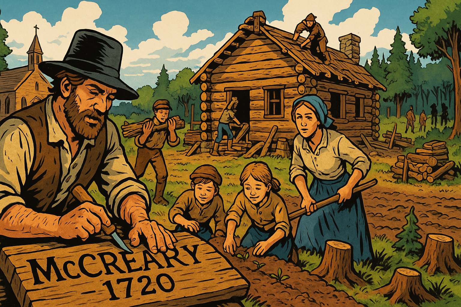 Panel 14 Please generate a wide landscape drawing of this scene using a graphic-novel style drawing. The width:height ratio is 16:9. Use a bright palette of colors. Make sure that each image is consistent with the style of prior images. Show the McCreary family on their new Pennsylvania frontier farm. They're building a log cabin (very different from their Ulster stone house), clearing forest, and planting crops. A Presbyterian church is being constructed in the background. Native Americans are visible in the distant tree line—a reminder that this "empty" land has its own complicated history. The family looks tired but hopeful, working together. In the foreground, place a wooden sign the father is carving: "McCreary Farm, 1720." The scene should feel like both an ending and a beginning—three countries and a century of migration finally reaching (temporary) resolution.The McCrearys settled in Pennsylvania's Cumberland Valley, then pushed south into Virginia and the Carolinas, becoming the quintessential American frontiersmen. They brought their Presbyterian faith, their whiskey-making skills, their fierce independence, and their experience with ethnic conflict (which, unfortunately, they'd apply to Native Americans). The journey from Scotland to Ulster to America had taken a century, but it created the "Scotch-Irish" character: stubborn, religious, suspicious of authority, and absolutely convinced they'd earned whatever they managed to hold onto. They'd finally found a place where nobody was above them telling them what church to attend. Of course, they'd soon fight another revolution about taxes, but that's a different graphic novel entirely.