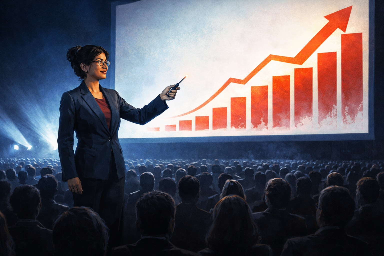 Panel 2 of 12. Generate a wide-landscape graphic novel drawing with a width:height ratio of 16:9. Use rich colors in the style of a thoughtful, cinematic graphic novel — expressive character faces, dramatic lighting, environments that reflect emotional tone. Not cartoonish. Do not put captions or text in the image. Show Dr. Priya — South Asian woman, early 40s, wire-rimmed glasses, dark hair in a bun, now in a professional blazer — standing on a large conference stage, laser pointer in hand. Behind her fills a massive projection screen showing a slide with bold red text indicating a dramatic speedup claim. She looks confident and proud. The conference hall is visible — a large audience, rows of faces. Stage lighting is bright on her, dramatic. Color palette: the bright white-blue of stage lighting, the bold red of the key slide, the dark sea of the audience beyond.Six months later, Priya stands on a stage in front of four hundred people, and the slide filling the screen behind her shows "100×" in bold red. She has rehearsed this talk twenty times. The result is real — the experiment showed it, the analysis confirmed it. She gestures toward the number with her laser pointer, and the audience is very attentive. Nobody in this room has reason to doubt her. Including her.
