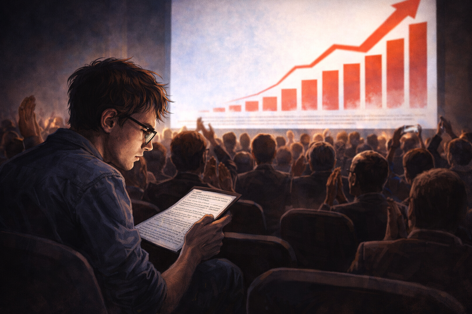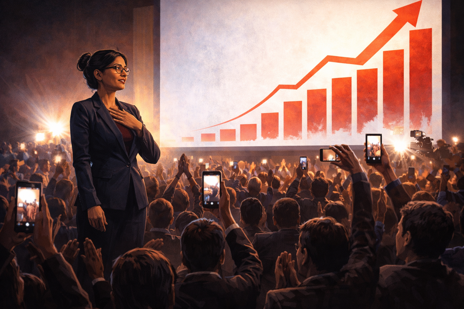 Panel 3 of 12. Generate a wide-landscape graphic novel drawing with a width:height ratio of 16:9. Use rich colors in the style of a thoughtful, cinematic graphic novel — expressive character faces, dramatic lighting, environments that reflect emotional tone. Not cartoonish. Do not put captions or text in the image. Show the conference hall erupting in applause after Priya's talk. People are on their feet. Many in the audience are holding up phones, photographing the slide still projected on the screen. Priya on the stage looks moved and slightly overwhelmed by the response. Camera flashes from the press area at the sides. The energy in the room is palpable excitement. Color palette: warm applause-light, flash bursts, the bright screen behind Priya, the room lit with enthusiasm.The applause begins before she finishes her final sentence. People are standing. Near the back, camera phones are raised, photographing the slide. She can see the red "100×" reflected in dozens of small screens. Priya smiles and thanks the conference organizers, and somewhere in the applause she feels, fully and without reservation, that she has done something important. It is a good feeling. It is the kind of feeling that makes careful people less careful.