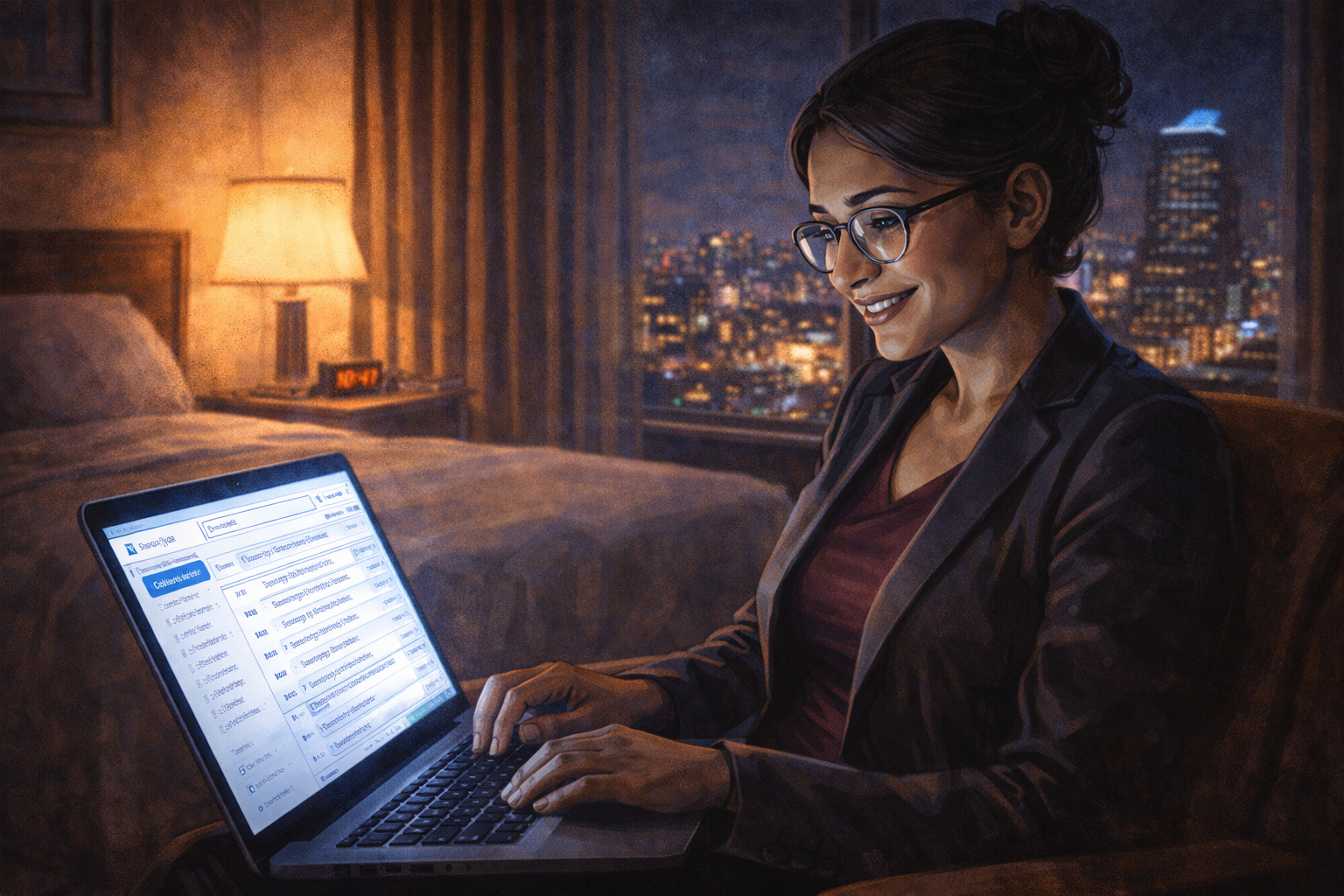 Panel 5 of 12. Generate a wide-landscape graphic novel drawing with a width:height ratio of 16:9. Use rich colors in the style of a thoughtful, cinematic graphic novel — expressive character faces, dramatic lighting, environments that reflect emotional tone. Not cartoonish. Do not put captions or text in the image. Show Dr. Priya — South Asian woman, early 40s, wire-rimmed glasses, dark hair in a bun — sitting in a hotel room that night, laptop open, her face lit by the screen glow. The laptop screen shows an overflowing email inbox, subject lines suggesting collaboration requests, interview requests, speaking invitations. Her expression shows genuine pleasure and a little overwhelm. The hotel room is generic but comfortable, the city visible through the window behind her. Color palette: blue-white laptop glow in a warm hotel room, the city lights beyond the window.By nine o'clock that evening, the inbox has forty-seven new messages with subjects like "Collaboration proposal," "Interview request," and "Keynote invitation." Priya reads them from her hotel bed, still in her conference blazer, eating room service crackers. She answers the most urgent ones. She forwards three to her department chair. She allows herself to feel, for a few hours, that things are going very well.
