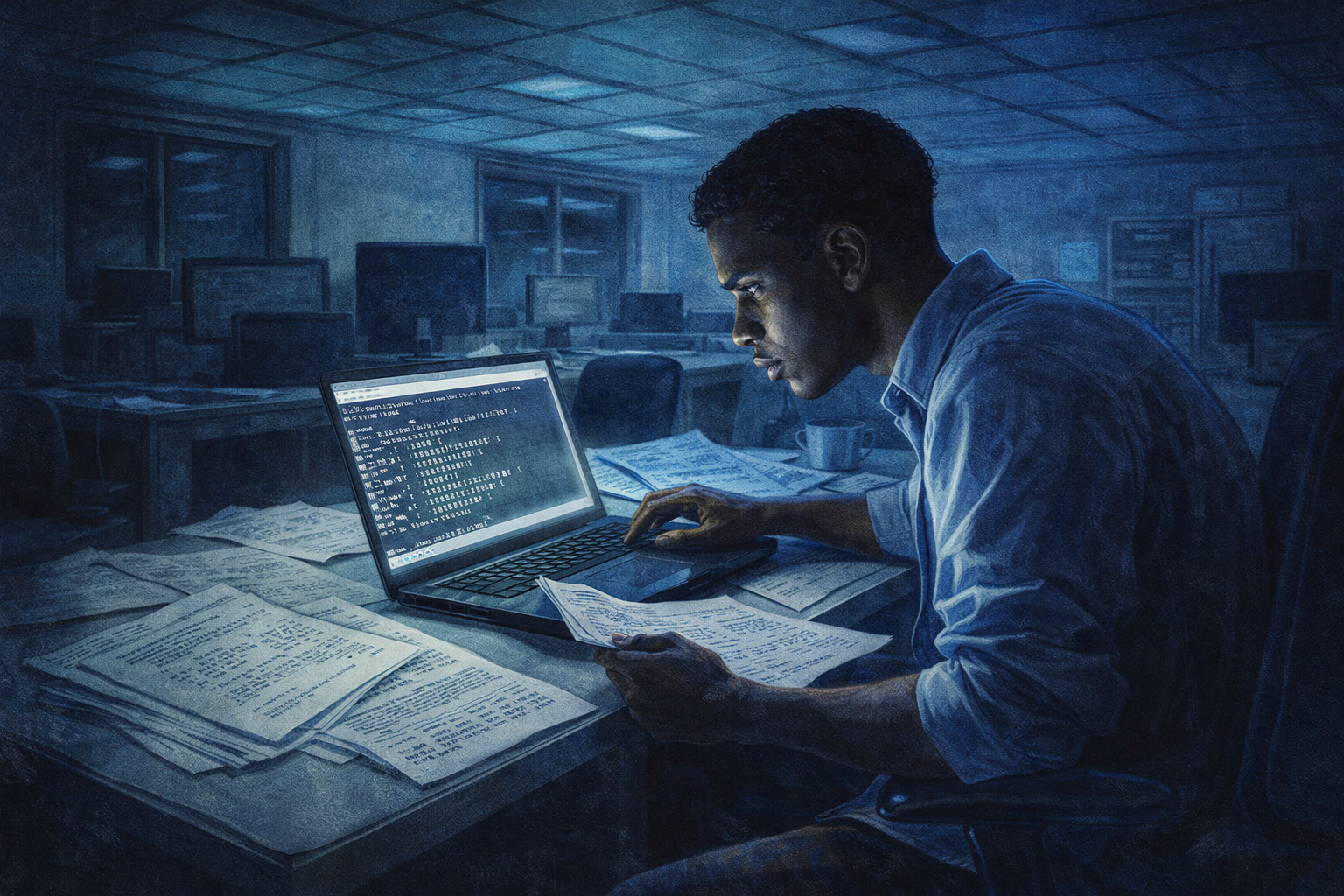 Panel 8 of 12. Generate a wide-landscape graphic novel drawing with a width:height ratio of 16:9. Use rich colors in the style of a thoughtful, cinematic graphic novel — expressive character faces, dramatic lighting, environments that reflect emotional tone. Not cartoonish. Do not put captions or text in the image. Show Kwame — the grad student from the conference back row — six months later, alone in a university computer lab at night, running code on a standard laptop. The screen shows terminal output, timing results. His expression is intensely focused, slightly tense. He has printed papers spread around him, cross-referenced. The room is otherwise empty, fluorescent lights humming. He is doing something careful and methodical. The atmosphere is quiet but charged. Color palette: cool blue-white fluorescent light, laptop screen glow, the isolation of late-night careful work.Six months after the conference, Kwame runs the classical baseline — the right baseline, the current best-known algorithm, not the one in Priya's footnote. He is methodical: he runs it three times, with different seeds, on three problem sizes. He is not trying to find an error. He is trying to make sure he isn't making one himself. The timing results come back clean, consistent, and deeply inconvenient.