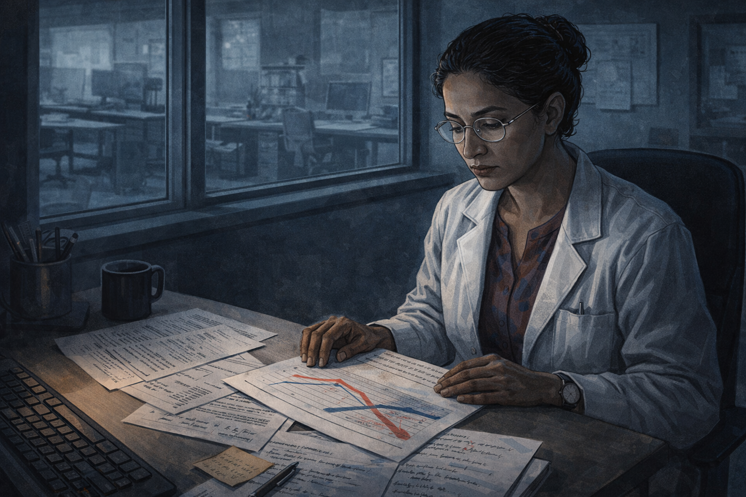 Panel 10 of 12. Generate a wide-landscape graphic novel drawing with a width:height ratio of 16:9. Use rich colors in the style of a thoughtful, cinematic graphic novel — expressive character faces, dramatic lighting, environments that reflect emotional tone. Not cartoonish. Do not put captions or text in the image. Show Dr. Priya — South Asian woman, early 40s, wire-rimmed glasses, dark hair in a bun — sitting at her university desk, a printed report in front of her. She is very still. Her expression is the controlled stillness of someone processing something unwanted but true. On the desk around her: the original paper, her conference notes, and now Kwame's replication data. The lab beyond her office window is visible. The moment has a heavy, quiet quality. Color palette: cool morning lab light, Priya in the foreground in a muted palette that reflects the weight of the moment.Priya reads Kwame's methodology twice, then checks his implementation herself, then asks her own postdoc to verify the classical baseline choice. The postdoc comes back in two days: Kwame is right. She sits at her desk with the results in front of her and the quiet in her office is complete. She did not lie. She used the baseline that existed when she did the work, the one that seemed correct, the one everybody used. That is not the same as it being right.