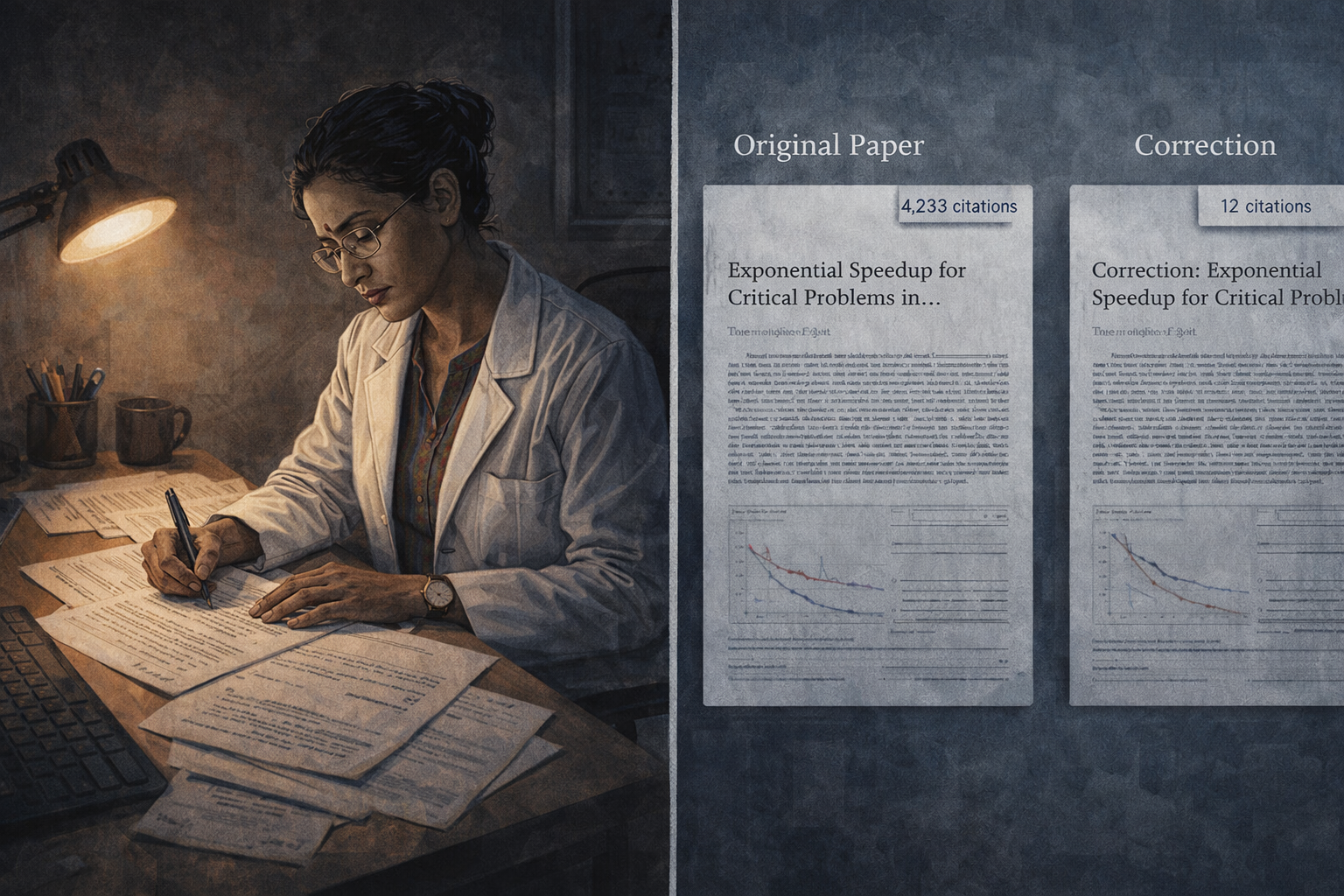 Panel 11 of 12. Generate a wide-landscape graphic novel drawing with a width:height ratio of 16:9. Use rich colors in the style of a thoughtful, cinematic graphic novel — expressive character faces, dramatic lighting, environments that reflect emotional tone. Not cartoonish. Do not put captions or text in the image. Show a split composition: on the left, Dr. Priya alone at her desk rewriting the corrected paper, expression determined and weary. On the right, two publication pages side by side — the original paper with a large citation count visible (4,000+) and the correction paper with a much smaller one (12). The contrast is stark and visual. Priya's face on the left reflects the quiet dignity of doing the right thing regardless of the audience it will find. Color palette: warm desk lamp on Priya writing, cool academic blue-grey for the publication comparison on the right.Priya rewrites the paper herself. She sends it to Kwame for review before submission — he is listed as second author. The correction is thorough, honest, and carefully worded. It is not a retraction. It is a recalibration. The original paper has 4,000 citations by the time the correction publishes. The correction will accumulate twelve over the following year, mostly from researchers who study scientific error correction rather than quantum computing.