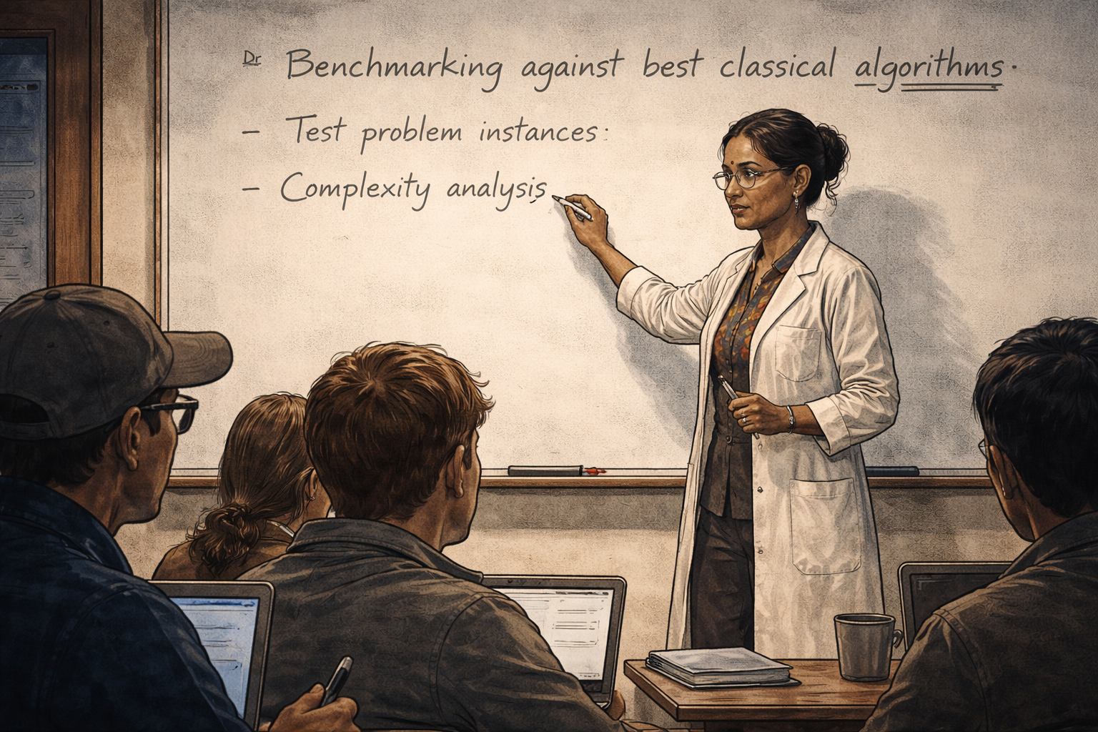 Panel 12 of 12. Generate a wide-landscape graphic novel drawing with a width:height ratio of 16:9. Use rich colors in the style of a thoughtful, cinematic graphic novel — expressive character faces, dramatic lighting, environments that reflect emotional tone. Not cartoonish. Do not put captions or text in the image. Show Dr. Priya — South Asian woman, early 40s, wire-rimmed glasses, dark hair in a bun — at the front of a graduate seminar room, writing on a whiteboard. The whiteboard text reads something about benchmarking against best classical algorithms. Her posture is confident and direct; she is teaching from experience. Graduate students face her, some taking notes. The atmosphere is serious and engaged. Color palette: warm classroom light, the clean white of the whiteboard, Priya's presence commanding and earned.Two years later, Priya teaches a graduate seminar on benchmarking methodology. She does not hide what happened — she uses it as the first case study, her own paper, her own error, her own correction. "Always benchmark against the best classical algorithm," she writes on the board. "Not the best classical algorithm from when you started the project. The best one available today." The students write it down. Some of them will remember it. Some of them will not.
