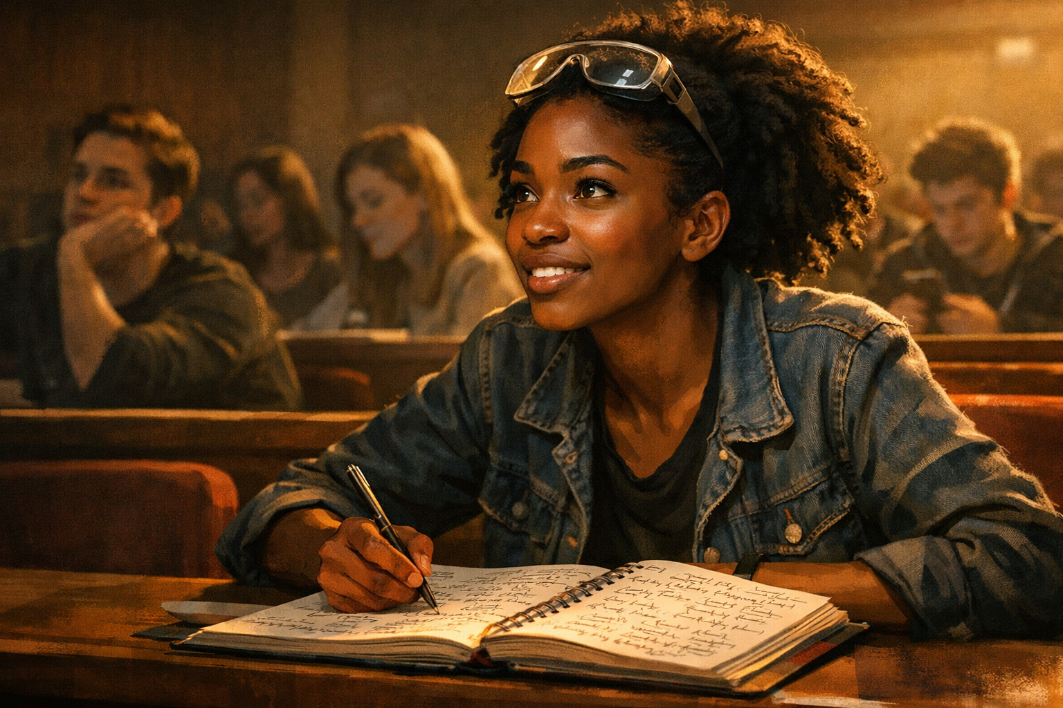 Panel 1 of 14. Generate a wide-landscape graphic novel drawing with a width:height ratio of 16:9. Use rich colors in the style of a thoughtful, cinematic graphic novel — expressive character faces, dramatic lighting, environments that reflect emotional tone. Not cartoonish. Think Saga or Maus rather than superhero comics. Do not put captions or text in the image. Show Zara — a Black woman, late 20s (younger here, so early 20s), natural hair, safety glasses pushed up on her forehead — in the front row of a university quantum computing lecture. Her notebook is full of furious notes. Her expression is complete absorption — the look of someone who has just found the thing. The lecture hall around her is visible, other students present but less visibly engaged than she is. Color palette: the warm lecture hall light, Zara in bright forward focus against the ambient student surroundings.Zara is twenty-two and in the front row of Introduction to Quantum Computing, and the professor is describing superposition for the first time in her education and something in her brain clicks and does not unclick. Her pen cannot move fast enough. She fills three pages in one lecture. After class she goes to the library and doesn't leave until the building closes. This is the day she decides.