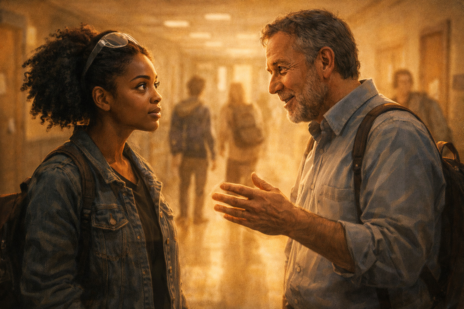 Panel 2 of 14. Generate a wide-landscape graphic novel drawing with a width:height ratio of 16:9. Use rich colors in the style of a thoughtful, cinematic graphic novel — expressive character faces, dramatic lighting, environments that reflect emotional tone. Not cartoonish. Do not put captions or text in the image. Show the hallway outside the lecture hall after class — Zara talking with her professor, a man in his 50s, warm and genuine. He is leaning slightly forward as he makes his point — he is telling her something he believes. Zara is listening with the intense attention of someone whose future is being described. Both of them are sincere in this moment. Color palette: the hallway light after lecture, the warm human quality of a mentor encouraging a student.After class, Zara catches the professor in the hallway. She asks two questions about stabilizer codes. He answers them and then says: "The students who get PhDs in quantum computing over the next five years will have their pick of positions. The field is expanding faster than the talent pool." He says this because he believes it. He has been watching the field for twenty years and he is tracking the investment curves. He is not wrong about the investment. He is wrong about what follows from it.