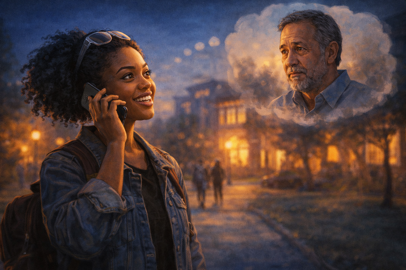 Panel 3 of 14. Generate a wide-landscape graphic novel drawing with a width:height ratio of 16:9. Use rich colors in the style of a thoughtful, cinematic graphic novel — expressive character faces, dramatic lighting, environments that reflect emotional tone. Not cartoonish. Do not put captions or text in the image. Show Zara on the phone, standing outside on the university campus in the evening. Her expression is the excitement of a decision made. On the other end of the call, her father's face is shown as a small thought-cloud or partial frame — a man in his 50s, loving but practical, asking the practical question. Zara's answer is visible in her expression: complete confidence. Color palette: the evening campus light, Zara's warm certainty against the cooler evening.She calls home that evening. "I'm going to do the PhD," she tells her father. He is quiet for a moment. "Are there jobs?" he asks. It is a reasonable question from a man who grew up in a family where employment was not a given. "Professor says absolutely," Zara says. "The field is exploding." Her father says he is proud of her. He does not say: ask the professor for data. Neither of them has thought to ask that yet.