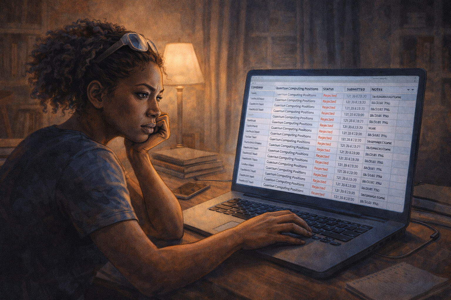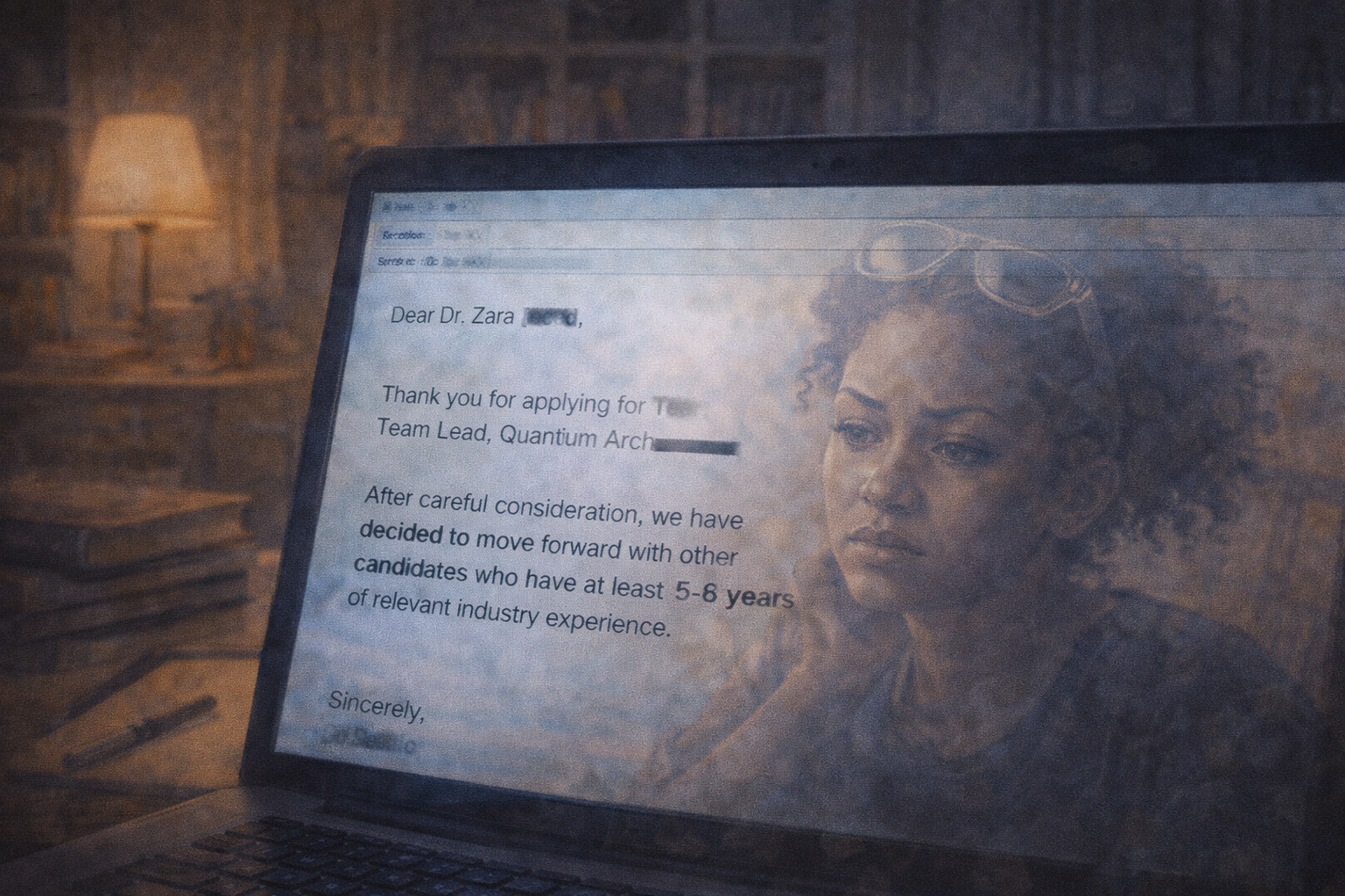 Panel 6 of 14. Generate a wide-landscape graphic novel drawing with a width:height ratio of 16:9. Use rich colors in the style of a thoughtful, cinematic graphic novel — expressive character faces, dramatic lighting, environments that reflect emotional tone. Not cartoonish. Do not put captions or text in the image. Show Zara's laptop screen with a rejection email open — the kind where one phrase carries the weight: a requirement for years of industry experience. Zara's reflection is faintly visible in the screen. Her expression has the weariness of someone who has read a version of this sentence many times. The home or apartment setting around the laptop suggests she has been job searching for weeks. Color palette: the screen glow in a home setting, the close focus of a single email that represents a pattern.The rejection she reads on a Tuesday at 9 a.m. is typical and not personal: "We are looking for candidates with 5+ years of industry experience in superconducting qubit systems." She has zero years of industry experience. The PhD is five years. She was in school. The industry was too young to have people with both the PhD and the industry time. The posting is asking for a combination that essentially does not yet exist.
