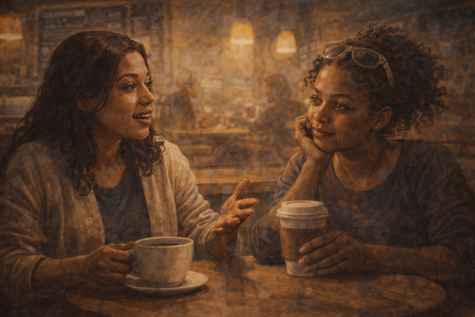 Panel 7 of 14. Generate a wide-landscape graphic novel drawing with a width:height ratio of 16:9. Use rich colors in the style of a thoughtful, cinematic graphic novel — expressive character faces, dramatic lighting, environments that reflect emotional tone. Not cartoonish. Do not put captions or text in the image. Show a coffee shop — Zara and a friend from her PhD cohort, a woman her age, sitting with drinks. The friend is describing her new position: an HPC company, not quantum. Her expression is the pragmatic peace of someone who has landed somewhere real. Zara is listening, her own expression a mix of genuine warmth for her friend and private reckoning with what this implies for herself. Color palette: the warm coffee shop light, the intimate setting of two people who have been through something together comparing notes.Her cohort friend Min landed a position at an HPC company — high-performance classical computing, optimization problems, real data, real customers. "It's not what I pictured," Min says over coffee. "No cryostats, no entanglement. But the problems are hard and the team is smart and they needed exactly what my PhD built. And I start in three weeks." Zara is happy for her. She is also sitting with the difference between what the professor promised and what Min's job description contains.