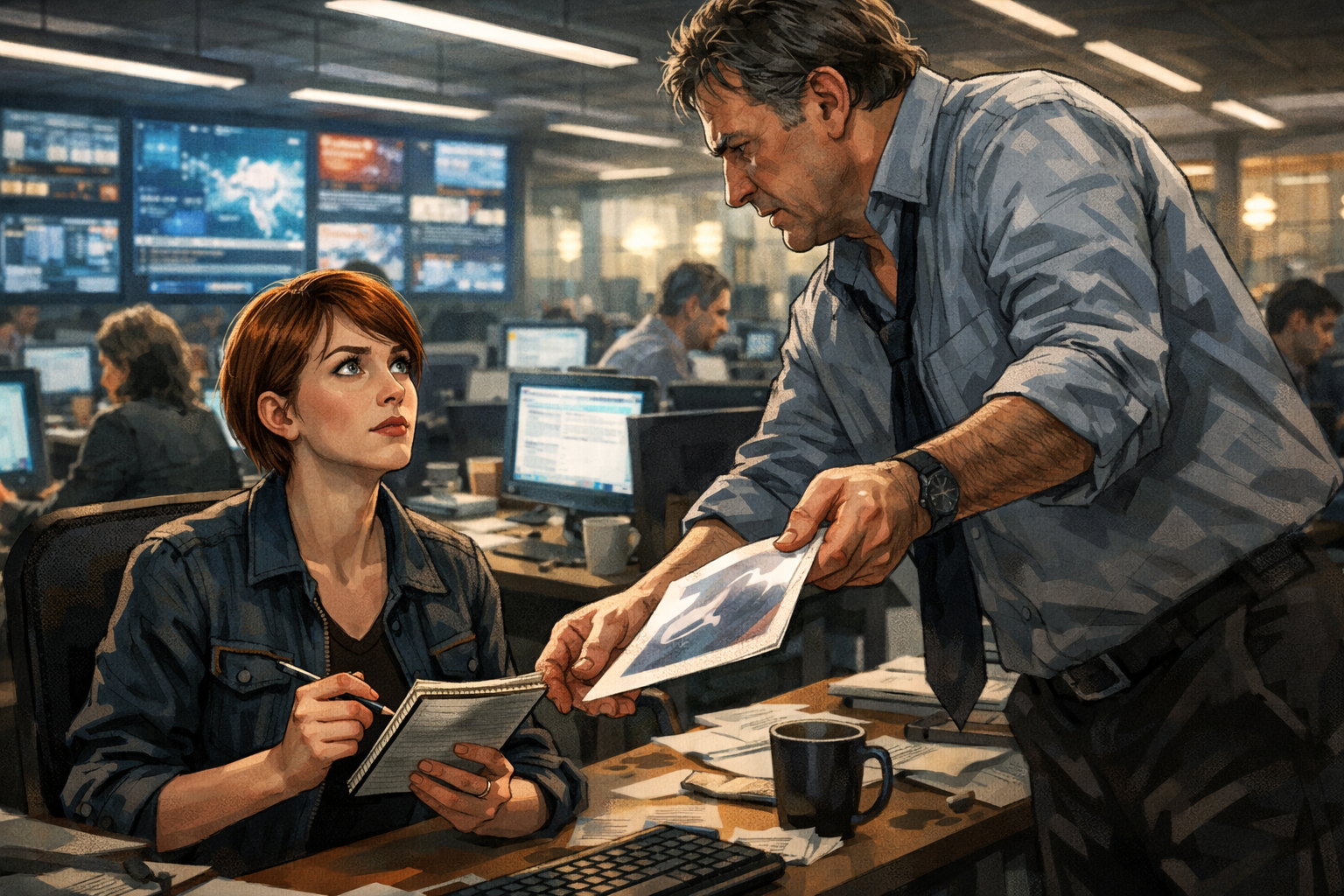 Panel 1 of 12. Generate a wide-landscape graphic novel drawing with a width:height ratio of 16:9. Use rich colors in the style of a thoughtful, cinematic graphic novel — expressive character faces, dramatic lighting, environments that reflect emotional tone. Not cartoonish. Think Saga or Maus rather than superhero comics. Do not put captions or text in the image. Show a busy technology newsroom — open office, desks with monitors, a wall of screens. Sasha — a white woman, early 30s, short auburn hair, reporter's notebook in hand, quick observant eyes — sits at her desk as her editor, a harried-looking man in his 50s, drops a glossy press release on her desk from above. His posture says urgency. Sasha is looking up at him, expression alert, notebook already in hand. The newsroom hums around them. Color palette: the bright and slightly harsh light of a modern newsroom, the sense of deadline pressure in every element.Sasha's editor drops the press release on her desk the way editors drop things when they have already decided it's a story. "This is huge — file by Thursday," he says, and is already walking away. Sasha picks it up. The headline uses the phrase "classical computing obsolete." She turns it over looking for the technical details. They are on the back, in smaller type, written by a PR firm. She opens her reporter's notebook.