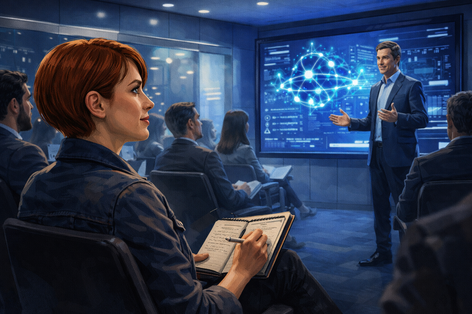 Panel 2 of 12. Generate a wide-landscape graphic novel drawing with a width:height ratio of 16:9. Use rich colors in the style of a thoughtful, cinematic graphic novel — expressive character faces, dramatic lighting, environments that reflect emotional tone. Not cartoonish. Do not put captions or text in the image. Show a polished corporate demonstration room — a tech startup aesthetic, good lighting, a large monitor showing impressive quantum visualization graphics. A confident CEO type stands at the front presenting to a small invited press group. Sasha — white woman, early 30s, short auburn hair — sits in the front row with her notebook open, nodding and writing notes. Her expression is attentive and professional. The presentation around her looks expensive and well-rehearsed. Color palette: the cool brand-blue of a polished tech presentation, Sasha in the warm foreground.The company demo is impeccably staged. A large screen shows abstract visualizations of quantum circuits solving problems in real time. The CEO — a man in his late 40s with the relaxed confidence of someone who has given this pitch three hundred times — walks Sasha through the key claims in a voice that is simultaneously enthusiastic and casual, as if the historic nature of what he is describing is simply the obvious state of affairs. Sasha writes "first ever," "impossible for classical," and "historic" in her notebook. These are words he used. She is noting them accurately.