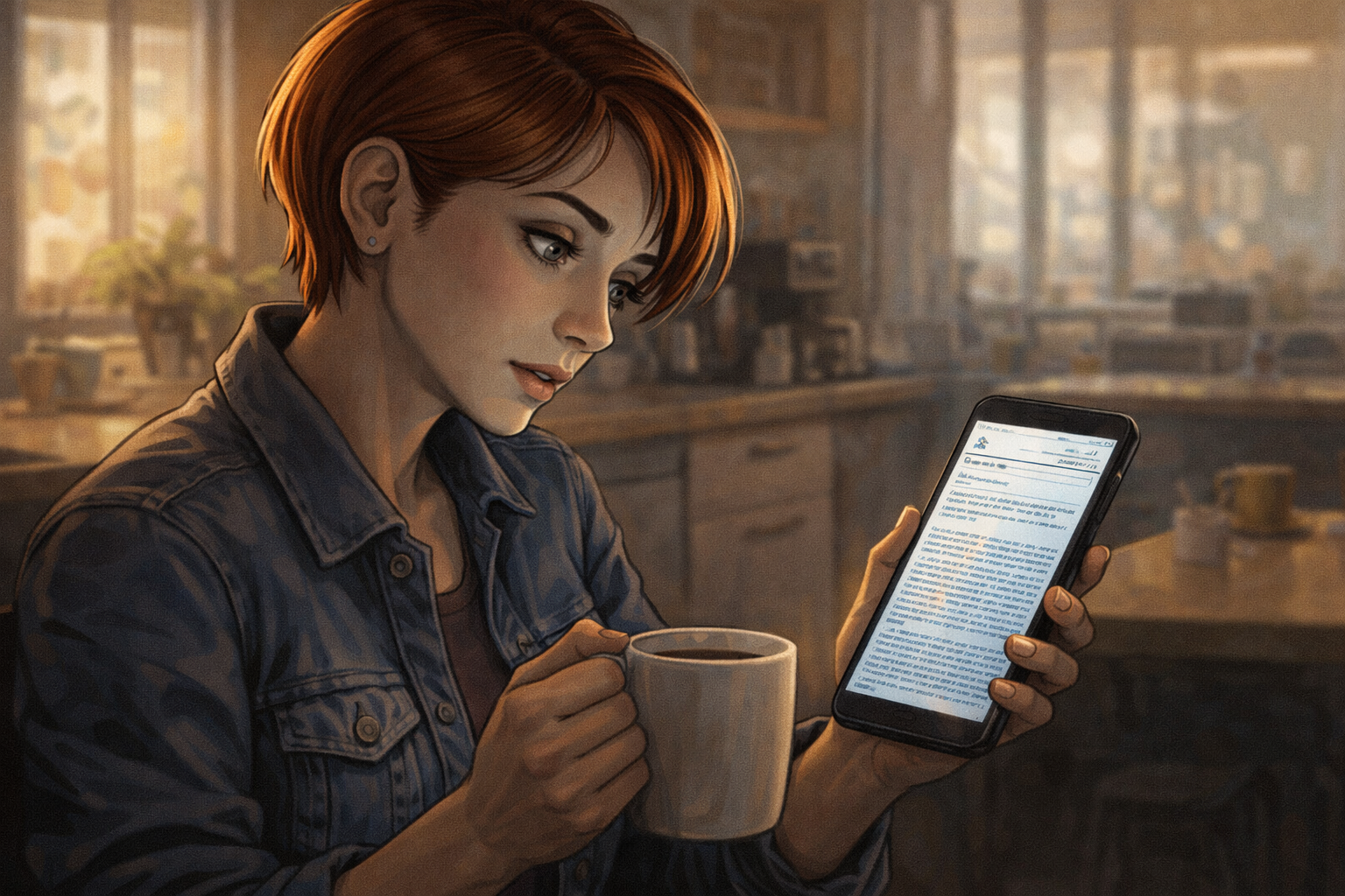 Panel 7 of 12. Generate a wide-landscape graphic novel drawing with a width:height ratio of 16:9. Use rich colors in the style of a thoughtful, cinematic graphic novel — expressive character faces, dramatic lighting, environments that reflect emotional tone. Not cartoonish. Do not put captions or text in the image. Show Sasha the next morning, coffee in one hand, phone in the other, reading something. The phone screen shows an academic preprint — the kind with dense text and a sparse header. Her expression is shifting — she started reading casually and now something has pulled her attention fully in. The preprint describes a classical replication of the quantum result. The scene is quiet — a kitchen or coffee shop morning. Color palette: gentle morning light, the contrast between the ordinary setting and the significance of what she's reading on her phone. Generate the image now.A preprint lands on arxiv twelve days later. Three university researchers — two grad students and a professor, using a laptop and a cluster of classical computing nodes — have replicated the key results of the demo in four seconds. The paper is clear, methodical, and polite. It doesn't accuse anyone of fraud. It simply shows the work. Sasha reads it on her phone over morning coffee and something cold settles in her stomach.